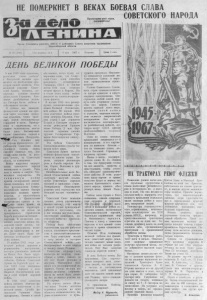 9 мая 1967 года « З А Д Е Л О Л Е Н И Н А » 3 С самого начала войны на советской земле широко разверну лось партизанское движение. На снимке: командир партизанского отряда беседует с крестьянами— членами группы самозащиты. Треть призванных н а г р а ж д е н а мию более восьми т ы с я ч ч е л о в е к . И з них о ко ло д в у х с половиной т ы с я ч за боевые з а с л у г и награждено орденами и медалями С о в е т с к о г о С ою за . В е л и к и й ратны й подвиг с о вершили со в е тс ки е люди в 1941-45 годах. Труднейший п у т ь от под с ту п о в к М о с к в е и б е р е г о в В о л г и п р ош л и до предместий ф а ш и с т с к о г о л о г о в а — Б е р л и н а солдаты нашей армии. В общие усилия с о в е т с к и х В о о р у ж ё н н ы х С и л по ра з г р о м у г и т л е р о вс ки х п о л чищ внесли свой вклад и се веряне. З а годы В е л и к о й О т е ч е с т венной войны в районе б ы л о п р и зв ано в д е й с т в у ю щ у ю арА трое особо о тли чи вш и х с я во инов-северян— капитан А л е к сандр Л а в р е н т ь е в и ч Б у г а ё в , ст а р ш и й лейтенант Ан атолий В а с и л ь е в и ч Б о р и с к и н и рядовой Н и к о л а й Трофимович Ш е р с т о б и т о в — у д осто ен ы З о лотой З в е з д ы Г е р о я С о в е т с к о го Сою за . КАК Я ЗАБУДУ О ВОЙНЕ К ак я забуду о войне, Когда она сидит во мне? Друзья, которых я зарыл, Навек в меня вошли, В груди Их холмики могил Травой не заросли. Я сердце сквозь войну пронёс, И вплоть до этих дней Оно полно, как губка, слёз Детей и матерей. Немые зарева огня, Костры горелых груд Нет-нет и в сердце у меня Оп ять пылать начнут. Но тяжело большой войне, И трижды тесно ей Греметь, стонать, пылать во мне, В одной груди моей. Я и войну не ворошу, Я молча гнев и боль ношу. Но чу тко сердце у солдат, Всё остаётся там: Все бомбы, что сейчас летят На огненный Вьетнам. И стон сирот, И рёв огня— Всё слышно в сердце у меня. И враг— он вот он, на виду: Я каждой бомбе счёт веду. М . Ш е с т е р и к о в . Никто не забыт 1919 год. Год разгула колчаковщины в Сибири. Карательные отряды омского правителя побивали и в сёлах Верх-КрасноярекоА волости. Они жестоко и беспощадно расправлялись со всеми, кто подозревался в сочувствии к Советской власти, ж гли и даже раскатывали дома, угоняли скот, расстреливали' невиновных. Против колчаковцев действовали партизанские отряды. Нелегко им было, но народные мстители стояли насмерть, проявляли ге роизм и находчивость. Однажды фельдфебель с двумя солдатами схватили партизанского связ н о г о Бухтиярова и инсценировали над ним суд. За столом сидели « с уд ь и »— милиционеры, назначенные колчаковцами, ион. Всем командовал прапорщик. — Ну-с, рассказывай, откуда пожаловать извол и л ? — с издевкой спросил офицер. — Откуда ж е мне ж ало вать, мой дом в этой деревне. Долго допрашивали, а потом избивали Бухтиярова. Но ничего не с к а з а л партизан, не вы дал своих товарищей. Ночью его расстреляли. Т а к отдал свою ж и зн ь этот простой крестьянин. Погиб за идею, твёрдо и непоколебимо веря в Советскую власть. Карательный отряд имел з а д а ч у — уни чтожить всех партизан, упрочить колчаковскую в л а с т ь . Кто-то вы дал партизан, сообщил прапорщику месторасположение их небольшого отряда. Каратели на конях двинулись в тайгу. Партизаны, ничего не знавшие о надвигавшейся СМ ЕРТ Ь П А Р Т И ЗА Н А Один орден К расной З в е з ды солдат Г уб ай д ул и н п о л у чил в боях за освобождение Л а т в и и . Э г о б ы л о летом 1944 г о да. В о время артиллерий ского об с тр