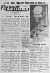ЗАВТРА-ДЕНЬ РОЖДЕНИЯ ПИОНЕРСКОЙ ОРГАНИЗАЦИИ Багряный г а л с т у н , пламеней П р о л е т а р и и всех стр ан , соеди няй тесь ! Ор ган С ев ерн ого р а й к о м а К П С С и районного С о в е т а д е п у т а т о в т р у д я щ и х с я Н о в о с и б и р с к о й о б л а с т и № 60 (3007) Год издания 32-й 18 мая 1967 г. Четверг Цена 2 коп СЛАВНЫЕ Д Е Л А ПИОНЕРИИ В с я ж и з н ь пионерских д р у ж и н района в те к ущ е м году проходит иод знаком подготовки к празднованию п я т и д е с я т и л е т и я Советской в л а с т и . А завтра в день р ож д е н и я Всесоюзной пионерской организации имени В . 11. Ленина состоится с л ё т пионеров. На нём б у д у т подведены итоги т р ё х л е т к и — соревнования пионеров и школьников в ч е с т ь ю б и л е я О ктября, проходивш его под девизом « Сияйте , Ленинские зв ё зды» . В слёте б у д у т участво- м ф л у ч ш и е пионерские о т р я д ы — по одному от к а ж дой школы — победители соревнования внутри школ. У ч а с т н и к и сл ё та п р и в е з у т с собой рапорты — альбомы, повествующие о делах пионеров, 'о их достижениях за три года соревнования. А в конце мая будет проведён слёт «красных следопытов». Примечательно, что «следопыты» выйдут в Северное из своих сёл пешком и б у д у т идти в т е ч е ние трёх-четырёх дней, о с т а н а в л и в а я с ь в деревнях, которые б у д у т л е ж а т ь на их п у ти . В каждой со с то я т с я церемонии возложения в е н к о в к п а м я тн и к а м пог и б ш и х воинов, пионеры побывают в г о с т я х у мест- 1Ш Щ , школьников. В н а з н а чен тый день в 10 часов у тр а все отряды «красных следопытов» одновременно в ойд у т в Северное и прим у т у ч а с т и е в торжественной линейке. Все они приб у д у т в форме «кра сны х следопытов». На с л ё т е пионеры р а с с к а ж у т о своих делах, поделятся опытом, накопленным за годы поисков героев— у ч а с т н и к о в революции, партизан, у ч а с т н и ков Великой Отечественной войны. Почти в каждой школе района созданы у г о л к и и м у зе и боевой и трудовой с л а в ы , краеведческие м у зеи. Многие школы собирают ма териалы по истории своих сёл и деревень. У ч а с т ники сл ё та п о зн а к ом я т ся с работой «красных с л е д о п ы тов» Дома пионеров, которые потрудились очень много, создав музей боевой с л а в ы , и завоевали право носить имя Героя Советского Союза А. Л. Б у г а ё в а . Заверш и тся слёт военной игрой. Л у ч ш и е «следопыты» поедут на э кс к у р с и ю в Новосибирск. Это будет нм наградой за их кропотливый труд. Более оживлённой с т а л а в юбилейном году и к р у ж к о в а я работа. Во многих ш к о л а х района работают к р у ж к и юных физиков, хи миков, математиков, « ум е лые руки» и другие. Б о л ь шие успехи и у к р у ж к о в цев Дома*пионеров. |Особой похвалы з а с л у ж и в а ю т наши юные фотографы. Они оформл яют тематические стенды, делают фотокопии для м у зе я боевой с л а в ы Дома пионеров и для школ района. Т а к , члены фотокружка сделали серию у д а ч н ы х снимков и оформили стенд «Проводы русской зимы». Много по тр уд и ли с ь они во время встречи малого факел а. Б о л ь ш и х успехов достиг и танцевальный ‘fcколлектив Дома пионеров. Не однажды он у ж е в ы с т у п а л с концертами. Очередной концерт члены этого к р у ж к а ’ дадут на сл ё т е в ч ес т ь д н я ^ р ож дения пионерской организации. Неплохих у спехов достигли и школьники , посещающие к р у ж о к «умелые р у ки » , Много сл а вны х дел на с ч е т у пионеров нашего района. Они стрем ятся не о т с т а т ь от своих отцов и матерей, с