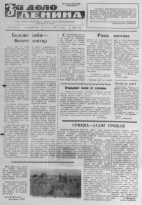 Пролетария всех стран, соединяйтесь! Орган Северного райкома К П С С и районного Совета депутатов трудящихся Новосибирской области № 102 (3 0 4 9) Гол издания 33-й 24 августа 1967 г. Четверг Цена 2 коп. 1 I [ С о з д а н и е м а ш е р и а л Ь н о - ш е х н и ч е с к о й б а - зЫ к о м м у н и з м а н а о с н о в е р а з в и т и я н а у к и и т е х н и к и , м е х а н и з а ц и и и а в т о м а т и з а ц и и , н е п р е р ы в н о г о р о с т а п р о и з в о д и т е л ь н о с т и т р у д а - г л а в н а я э к о н о м и ч е с к а я з а д а ч а с о в е т с к о г о о б щ е с т в а . ( И з Тезисов Ц К К П С С к 50-летию Великой Октябрьской социалистической революции). Safe Больше зяби— богаче гектар А в г у с т один из самы х н а п р я ж е н н ы х периодов в работе хлеборобов. Не з а к о н ч и л с я еще сенокос, к а к подошла страдна я нора. Надо т а к ж е с е я т ь рожь, з а к л а дывать силос, скирдовать солому и п а х а т ь з я б ь , готовить фундамент под урож а й б удущего года. В пользе зяблевой в с п а ш ки теперь никто не сомнев а е т с я . Многолетний опыт п о к а з а л , ч т о путем заготовки земли в летне-осенний период можно л у ч ш е бороться с сорняками. З я б ь р а з г р у ж а е т весной от такой трудоёмкой работы, к а к п ахо та , спосбб- Ч Ц и у с т накоплению в почве в ла ги и сокращению сроков сева яровых к у л ь т у р . Г л а в ное ж е преимущество зяби перед весновспашкой — это то, что на ней колхозы пол у ч а ю т более высокий уро ж а й д аже в самые з а с у ш ливые годы. Вот почему очень в а ж н о з а г о т о в и т ь в сю землю с осени. Фронт уборочных р а бот на полях колхозов ширится с к а ж д ы м днём. Ж а т ва ржи б л и з и т с я к концу. На больших площадях с к о шен подсолнечник и к у к у р у з а . П а хар ям е с т ь у ж е где р а з в ер н у т ь с я . И всё-таки ни в одном из х о з яй с т в в з м е т у з я б и до настоящего времени не придали серьезного зн а ч ени я . <)б этом свид е тел ь ст в уе т ю т факт, что на 20 а в г у ст а поднято всего-навсего несколько десятков г е к т а ров в Малиновской бригаде сельхозартели им. X X I I с ъ е з да K1ICC да только что прист упи ли к пахоте в колхоз а х «Восход» и « П а м я т ь Ленина» , тогда к а к по району предстоит в с п а х а т ь 17600 гектаров. З а т я ж к у с началом п а х о ты многие руководители и агрономы колхозов пы т аю т с я оправдать большой з а г р уженностью тракторного п а р ка . Но это не совсем так. Много г у се н и ч ны х тракто ров з а н я т о с е й ч а с днем на косовице силосных к у л ь т у р и трамбовке буртов. П очем у бы эти машины не использ о в а т ь ночью на в спаш ке з я б и ? Однако тракторы, к а к правило, и с п о л ь зую т ся только в одну смену . Выходит, что з а г р у ж е н ы они всего наполовину. Е с т ь и другой резерв. Е с ли пересмотреть и п р а в и л ь но р а с с т а в и т ь т е х н и к у на за го тов ке кормов, то высвободится ч а с т ь г у с е н и ч н ы х тракторов. А в ночные смены можно п у с т и т ь на пахо т у и те колесные машины, которые днём буксирую т се ял к и и силосные комбайны, подвозят к посевным агрегатам семена. Судьба будущего у р о ж а я р еш а е т с я се й ч а с . Поэтому сл едует немедленно сделать п ере с т ан о в ку в работе т е х ники и все высвободившиеся машины п о ст а ви т ь на подъ ём зябн . П а х о т у организов а т ь т ак , чтобы тракторы ни минуты не простаивали, и спол ьзовались с полной н а грузкой . Д ля каждой бригады важно у ст ан о ви ть твёрдое правило: уш ё л комбайн с поля— вслед за ним долж е н работать трактор с плугом . Н е л ь з я з а б ы в а т ь и о к а ч е с т в е подъ