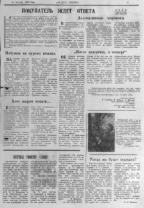 26 августа 1967 года « З А Д Е Л О Л Ё Н И Н А . » 3 ПОКУПАТЕЛЬ ЖДЕТ ОТВЕТА Р Е И Д П Е Ч А Т И Б июле наша газета рассказывала о достижениях коопера т оров района. И заслуженно : в первом полугодии они добились хороших р е зу л ь т а т о в и в области заняли первое место. Э т о известие, несомненно, обрадовало се верян . Д умалось. чтО работники прилавка б у д у т тр уд иться ещё л у ч ш е , в магазинах поя в я т с я но вые товары, расширится их ассортимент. А к а к ж е — в ы с о к о е звание передовика к это му об я зы вает ! Н о у ж е сейчас, че рез месяц, покупателя встречают в магазинах по л уп у с ты е полки, виновато разводят руками продавцы. П оложен ие не только у л у ч ш и л о с ь , но стало хуже . С обрался ч е ловек на сенокос, притом надолго, пошел в магазин— и вернул ся с банкой компота из персиков и килограммом твёрдо-каменных пряников. Приехал шофер с зерном нового ур о ж ая на хлебоприемный пу нкт, собрался пообедать— столо вая до сих пор не о т крыта. В ы во д один: за высоким „ з а бо р ом " показателей усп ок ои ло с ь правление райпотребсоюза и С еверного сельпо. А по к у п а те л ь не у с п о к о и л с я , он ж а л у е т с я . Рейдовая бригада проверила эти жа ло бы и обнаружила следующее. Избушка на курьих ножках Долгожданные перемены сопровождении заведу- ющей столовой т . И г - н зто в с ко й -’ проходим на к у х ню стол овой . Надо ска з а ть , что в р а б о те с тол овой , наконец, п о явились сдвиги. Увеличилось количество блюд в меню. Об у л у чш е н и и их качества г оворят п охвальны е о тзы вы посетителей. Б ольш е внимания стало уделяться с а н и тарном у состоянию к у х н и , холодильника , зала. Н о опять приходится о т мечать непростительные п р о махи ‘ в работе колл ектива стол овой . Н е точно у с т а н о в лены весы для взвешивания продукции. П о словам с т а р ш е го повара т. Ивановой „ т а к бы ло всегда". Н о ведь весы каждый год пр о ве р я ются и тако го не может быть. • В т р у д н ы х условий х рабо* тает мойщица. Горячая вода к месту мойкц не подведена. З а ней надо бегать в соседнее помещение. Т и та н не у становлен. Н о в целом впечатление т а к о в о , что в работе с т о л о вой появились определённые перемены. Э г о заметили и посетители. В кни ге ж алоб и предложений б о л ь ш и н с т в о записей с благодарностями. „После дождичка, в четверг*4 U Д окраине села, ря- I I / Л . дом с х л е б о пр и емным пун к том , стоит неприглядное здание. Над в х о дом вывеска : „М а г а з и н " , а дверь - за к ры та . О ка зал о сь, что магазин по давней „ т р а диции" перевели в соседний к и о с к . В освободившемся помещении намечается о т к р ы т ь с то л о в ую . А пока там п у с т о . Решили за глянуть в магазин. Н о во е помещение непос- ленный ср аз у и не раз- г ^ Г т : у ж больно оно напоминает и з б у ш к у на к у р ь и х н о ж к а х . Очень тесный ларек , в котором мирно у ж и ваются на п о л ка х пыльные бан ки , табачные изделия, пряники и б у л к и хлеба. А впрочем, — „хлеба ча с те н ь к о не за во зя т " , — г о в о ри т продавец т. Белоногова . Т а к что покупатель уже п р и вы к со ве рш а т ь пут е шествие за хлебом в центральный магазин. И з разговора с продавцом выясняется, что нет т е х т о варов , кото р ы е пользуются наибольшим спросом: к р у п ы , к о л б а с н ы х изделий, мало ф р у к т о в ы х кон сер вов . Н е давно завезли се лёдку, да и то непригодную в п и щ у . П р и ш л о с ь с п и с а т ь . .. Хоть шаром покати... В продмаге нас в с т р е т и ли, как с т а р ы х з 