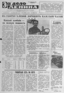 П рол ет ари и в с е х стран , со е д и н я й т е сь ! Орган Северного райкома К П С С и районного Совета депутатов трудящихся Новосибирской области № 108 (3055) Гол издания 33-й 7 сентября 1967 г. Четверг Цена 2 коп. С о з д а н и е к р у п н ы х с о ц и а л и с т и ч е с к и х х о з я й с т в - с о в х о з о в и к о л х о з о в , м е х а н и з а ц и я с е л ь с к о х о з я й с т в е н н о г о п р о и з в о д с т в а з н а ч и т е л ь н о с б л и з и л и с е л ь с к о х о з я й с т в е н н ы й т р у д с и н д у с т р и а л ь н ы м . П о в ы ш а е т с я о б щ е о б р а з о в а т е л ь н ы й и к у л ь т у р н о - т е х н и ч е с к и х у р о в е н ь с е л ь с к и х т р у ж е н и к о в . П р о и с х о д и т п о с т е п е н н о е с т и р а н и е с у щ е с т в е н н ы х р а з л и ч и й м е ж д у г о р о д о м и д е р е в н е й . (И з Тезисов Ц К К П С С „50 лет Великой Октябрьской социалистической революции“ ). НА УВОРКЕ ХЛЕБОВ ДО РОЖ И Т Ь К А Ж Д Ы М ЧАСОМ : . : • • « ______________ Кажды й комбайн — на п олн ую мощ ность Н и ж е печатается свод к а о ходе у б о р к и у р о ж а я и в с п а ш ки зяби. Ц и ф р ы неумолимо г о во р я т о том, что в ряде к о л х о з о в у бороч на я страда организована н е у д о в л е т в о р и тельно. В о з ьм ё м для сравнения два хо зя й с т в а , р а сп о л о ж е н ны е рядом и находящиеся в один а к о вы х у с л о в и я х — „ В о с х о д " и „ З а в е т ы И л ь и ч а " . Е с л и в первом убра но з е рновых 1260 гек тар ов , то во втором v всего 528. Ч т о , мож ет б ы т ь Г в „ В о с х о д е " комбайнов б о л ь н и ц е ? Н и ч е г о подобного. В том и другом по 11 машин. В с ё дело в организации труда на у б о р к е , в техни че ском о б сл уж и в ан и и механизмов. И другой пример. З а декаду с 25 а в г ус т а по 5 сен тя б р я по району пр и р о с т по у б о р к е зе р н о вы х со ставил 15,6 проц . К о л х о з „ В о с х о д " з а э т о время с к о с и л ^50,2 процента зе р н о вы х куль- ТУР> « П у т ь к к о м м у н и з м у " — 24,5. А „ З а в е т ы И л ь и ч а " дал п р и р о с т всего 11,4 проц. Е щ е х у ж е полож ение с у б о р к о й з е р н о в ы х в к о л х о зах им. К . М а р к с а , им. X X I I с ъ е з д а К П С С и « Б о р ь б а за м и р » . В этих хо зя й с тв ах за 10 дней п р и р о с т со с т ав и л от 6 до 10 процентов к у б о р о ч ной площади, или по г е к т а р у и менее на комбайн в день. Т а к о е положение д ал ьш е нетерпимо. П а р ти йн ы е о р г а низации, правления колхозов., специали сты и бригадиры д о л ж н ы сер ьёзно подумать о л у ч ш е й организации работы м еханизаторов в иоле. З е р но вы е надо у б р а т ь за 12— 15 дней. В ■ряде к о л х о з о в района ещё много ца кор ню с и л о с н ы х к у л ь т у р . Е с л и у б о р к а к у к у р у з ы не за кончена ещё т о л ь к о в д в у х х о з я й с т в ах — „ З а в е т ы И л ь и ч а " и „ Б о р ь б а за м и р " , то подсолнечник не с к о ш е н на б о л ьш и х п л о щ а дях. Э т о о тно си тс я к к о л х о зам „ П а м я т ь Л е н и н а " , „ Н о вая ж и з н ь " , „ П у т ь к к о м м у н и з м у " и нек о т о ры м другим. З а д а ч а со с т о и т в т о м , ч т о б ы л у ч ш е , производительнее исп о л ь з о в а т ь т е х н и к у и за нес к о л ь к о дней з а к о н ч и т ь у б о р к у с и л о с н ы х к у л ь т у р . Зн ан ом те сь : Василий П етрович Блинов, механизат о р нолхоза „ П у т ь н ком м унизм у1" . В горячее время хлебоуборки т . Блинов, нан и многие другие, т р у д и т с я на полях. С самого начала уборни хлебов он в з ял ся за дело по-настоящ ему. У т е на косовице ржи показал высокие т е м п ы, А сейчас т . Блинов н о си т овёс. Уверенно, мас~ тврсн и в о д и т он свой комбайн и не то л ько вы п о л н яе т , но и намного перевы полняет нормы, вынашивая по 20 — 25 ге 