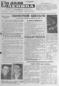 П р о л е т а р и я в с е х стран , со е д и н я й т е с ь ! О р г а н С е в е р н о г о р а й к о м а К П С С и р а й о н н о г о С о в е т а д е п у т а т о в т р у д я щ и х с я Н о в о с и б и р с к о й о б л а с т и № 153 (3100) Г о д и з д а н и я 3 3 - й 23 д е к а б р я 1967 г. Су б б о т а Це н а 2 коп. О гн и м о л д а в с к и х с е л В М о л д а в и и д о с т и г н у т ы с а м ы е в ы с о к и е з а п о с л е в о е н н ы е г о д ы т е м п ы э л е к т р и ф и к а ц и и с ё л . В э т о м г о д у к г о с у д а р с т в е н н ы м с е т я м п о д к л ю ч е н ы 5 4 т ы с я ч и д о м о в к о л х о з н и к о в и р а б о ч и х с о в х о з о в — н а 2 5 п р о ц е н т о в б о л ь ш е , ч е м п л а н и р о в а л о с ь . С е й ч а с з а д в е н е д е л и с е л ь с к о е х о з я й с т в о р е с п у б л и к и п о л у ч а е т с т о л ь к о э л е к т р о э н е р г и и , с к о л ь к о и с п о л ь з о в а л а е ё в с я М о л д а в и я в 1 9 4 0 г о д у . П я т и л е т к у д о с р о ч н о у СОЦИАЛИСТИЧЕСКИЕ ОБЯЗАТЕЛЬСТВА трудящихся С еверн ого района на 1968 г о д В области полеводства ( П р и н я т ы н а V е е с с и и р а й о н н о г о С о в е т а д е п у т а т о в т р у д я щ и х с я с у ч а с т и е м п а р т и й н о - с о в е т с к о г о и х о з я й с т в е н н о г о а к т и в а к о л х о з о в , п р е д п р и я т и й и у ч р е ж д е н и й ) Выполняя решения XXI I I с ъе з д а КПСС, мартовского ( 1965 г. ) и последующих Пленумов Центрального Комитета партии, трудящие с я района за два года пятилетки добились некоторых успехов в хозяйственном и куль т ур н о м строительстве. Район досрочно, к 15 октября 1967 г о д а , выполнил юбилейные обяз ательства по продаже г ос уда рс т ву продуктов животноводства. Труженики района г отовятся отметить 100- летие со дня рождения В. И. Ленина новыми трудовыми успехами. Вс тупа я в третий год пятилетки и идя навстречу юбилею В. И. Ленина, т рудящиеся района принимают , следующие обязательства: П я т и л е т н и й п л а н п р о и з в о д с т в а и п р о д а ж и м о л о к а в ы п о л н и т ь з а ч е т ы р е , м я с а — з а ч е т ы р е с п о л о в и н о й г о д а . Д о - Ip б и т ь с я д о с р о ч н о г о в ы п о л н е н и я п л а н а п р о д а ж и з е р н а . В области ж и в о т н о в о д с т в а 1 . Успешно провести зимовку скота, сохранить и увеличить общественное поголовье, подпить его продуктивность. 2. Получить по 1900 килограммов молока на корову, в т ом числе за зимний период по 10 центнеров. 3. Добиться н е менее 600 граммов привеса в сутки от молодняка крупного рогатого скота н а о ткорм е и 700 г рамм№*- на нагуле. 4. Выполнить годовой план продажи молока к 7 ноября 1968 года. Продать г осударству не меньше 100 ты с. центнеров молока и 15, 5 тысячи центнеров мяса. Для чего: на 1 января 1969 года иметь выходное поголовье крупного рогатого скота 18 тысяч голов, в том числе 6 тысяч к о р о в : обеспечить во всех животноводческих фермах механизацию поения к о р о в ; ' отобрать в каждом колхозе племенное ядро коров и с оз дат ь илеменные фермы с общим поголовьем по району 2400 г олов; снизить' ' себестоимость продуктов животноводства на 3 процента; получить от 100 маток не менее 85- 90 телят, 105 я г нят, от основной свинома тки—14 поросят; заготовить н а 5условпую голову 30 центнеров г рубых кормов н не менее 10 тонн силоса. , 5 . В два- три года соз дать в каждом колхозе многолетние культурные пастбища вблизи ф е р м . ¥ I 1 . Добиться урожайности зерновых не ниже 12, 5 центнера с г ектара. 2 . Получить валовой сбор зерна н е менее 300 тысяч центнеров и к 1 октября 1968 года выполнить п л а н - з а к а з по продаже хлеба государству. 3. Всю сельскохозяйственную технику отр