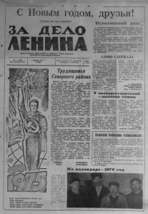 С Новым годом, д ру зья ! Пролетарии всех стран, соединяйтесь! Д Е Л . О Орган Северного райкома КПСС и районного Совета депутатов трудящихся Новосибирской области № 1 (4196) 1 ЯНВАРЯ 1975 г. Газета выходит по вторникам, Цена Г од издания 40 -й С Р Е Д А четвергам и субботам 2 коп. Исполненный долг С чувством исполненное*} долга встретили Новый год, з а вершающий год девятой пятилетки, животноводы колхоза им. XXII съезда К П С С . В истекшем году валовое про и з в о д . ство молока по сравнению с 1973 годом увеличено б ол ее чем на 2S процентов, а надой1 на корову возрос почти на пять центнеров. И вот в самый канун Нового года на заготовительные пункты были отгружены последние попета центнеров в счет годового задания. Два дня колхоз сдавал молоко в счет 1975 года. С р ед и животноводов особо высоких показателей по надою молока добились доярки А. Я. З уб к о , О . Д. Винникова, Е. А . Подскребышева, У . П. Слободчикова, Н. И. Тишечко, А . Д . Шурмелева, У . И. Гринькова, М. Е. Воробьева. С успехом вас, дорогие товарищи! В Новом году новых вам достижений! СЛОВО С Д Е Р Ж А Л А Т р у д ящ и м с я С е в е р н о г о района Дорогие товарищи, друзья ! Над страной утро нового, 1975 года. Такие дни на рубеже двух лет всегда исполнены большого значения: подводя итог пройденному пути, советские люди смотрят вперед, захвачены новыми планами на год наступивший. С чувством удовлетворения и гордости с о ветские люди провожают в историю 1974 год, определяющий год девятой пятилетки. Он принес немало хорошего . Это был год настоящего ударного труда всего нашего народа. Вместе со всем советским народом держали в этом году ответственный эк замен тр уд ящиеся Сев ерно го района — и выдержали е го успешно. Выполнены и перевыполнены планы промышленного производства. Радует нас и победа т р у жеников с ельского хозяйства района. Такого урожая зерна, какой Ьыл собран в 1974 году, наши земли не знали ранее. Досрочно выполнены планы по продаже государству молока и мяса. В районе выросли десятки мастеров ‘ производства. С гордостью за дости гнутое, с яркими п е р спективами на б уд ущ е е вступаем мы в новый, 1975 го д, год, когда весь наш советский народ будет отмечать 30-летие Победы над фашистской Германией во второй мировой войне, год, который подведет итоги работы в девятой пя тилетке. Районный комитет К П С С и исполком районного Со в ета депутатов трудящихся уверены, что и в 1975 году, завершающем году пятилетки, когда нам предстоит решать не м е н ее сложные и ответственные задачи, т р уд ящ и еся района, б е з заветно преданные своей любимой Родине, вновь покажут пример коммунистического отношения к труду. Доро гие товарищи с еверяне! Товарищи р а б о чие, колхозники и служащие! Ко всем вам, д о рогие друзья, мы обр ащ аем ся со словами новогоднего привета и поздравления, с сердечной благодарностью за все то доб р о е , что было сделано вами в минувшем году , и с искренними пожеланиями еще больших трудовых у с п е хов, здоровья в году грядущем. Пусть принесет он в каждую семью радость и счастье. С Новым годом, дороги е товарищи! С н о . вым счастьем! В е с ь к о л л е к т и в н а ш е й ф е р м ы б о р о л с я в о п р е д е л я ю щ е м г о д у п я т и л е т к и з а т о , ч т о б ы о б е с п е ч и т ь н а д о й м о л о к а по 23 00 к и л о г р а м м о в на к о р о в у . Л и ч н о я н е т о л ь к о с д е р ж а л а с в о е с л о в о , но и п е р е в ы п о л н и л а о б я з а т е л ь с т в о на д в а с п о 