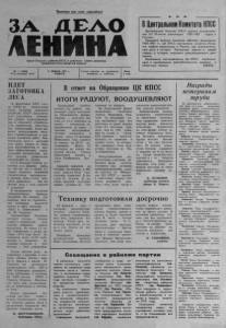 П р о л е т а ри и всех с т р а н , соединяйтесь! Орган Северного райкома КОСС г районного Совета депутатов трудящихся Новосибирской области № 5 (4200) 11 ЯНВАРЯ 1975 г . Г а з е т а в ы х о д и т по в т о р н и к а м , Ц е н а Г о д и з д а н и я 4 0 - й С УББО Т А ч е т в е р г а м и с у б б о т а м 2 к о п . В Центральном Комитете КПСС Центральный Комитет КПСС принял постановление «О 70-летии р е волюц ии 1905-1907 го д ов в России». Придавая важное значение ю б и л е ю ре во лю ц ии 1905-1907 гг., ЦК КПСС постановил отметить 70-летие первой революции в России, как знаменательн ую дату в истории Ленинской партии и нашей страны, в истории м и р о в о г о р е в о л ю ц и о н н о г о движения. * Изложение постановления ЦК КПСС о п у б л и к о вано в центральных, республиканских, краевых и областных газетах. (ТАСС) В ответ на Обращение ЦК КПСС И Т О Г И Р А Д У Ю Т , В О О Д У Ш Е В Л Я Ю Т И Д Е Т ЗАГОТОВКА ЛЕСА В Д и р е к т и в а х XXIV с ъ е з д а КПСС по п я ти л етн ем у пл ану р а з в и т и я народного х о з я й с т в а С С С Р пр ед у см о т - ' рено д а л ь н е й ш е е повыше-' ние у р о в н я и н д у с т р и а л и з а ции и сборности с т р о и т е л ь ства, прим ен ени е об л ег чен ных конструкций , бол ее ши рокое и сп ол ьзов ани е ме с тных с т р о йм ат ер и а ло в и сниж ение стоимости работ. З н а ч ител ьную ро л ь в решении этих з а д а ч , н а р я д у со сборным ж е л е з о б е то ном и д р у гими эф ф ек ти в ны м и строите л ьны м и м а т е р и а л ам и , мож е т с ы г р а т ь прим енение конструкций и з д е р е в а . Это -в большой степени относится и к н аш ем у р а й о ну, та к к а к л ес в наших у с ловия х я в л я е т с я основным с тр о и тел ьны м м а т е р и а л ом . В р а з г а р е з и м а —с ез о н з а го товки дре ве сины . К ак ж е обстоят д е л а с этой работой в ко л х о з ах ? В большинстве к олхо зов у к ом п л ек то в а н ы бригады л есорубов . Но те х н и к а д л я вы в о зк и л е с а на с т р о и т е л ь - - ные п л ощ а д ки в ы д е л е н а тол ько в двух к о л х о з а х — «П у ть к ком м у н и зм у » и им. М. Горького. Л е с о за го т о в к е б л аг о пр и я т с т в у е т погода. Однако темпы в п р ов едении этой в аж ной кампании крайне м е д л ен ны е . Из п л ан а 12 ты сяч кубометров к ко н цу д е к а б р я 1 9 7 4 года было з а готовлено всего 2 1 0 0 ку б о м е тр о в , а в ы в е з е н о на у с а д ь бы кол х о з о в и того м еньше — 8 0 0 кубом е тров . Л у чш е обстоят д е л а , по с р авнению с дру гим и , в к о л хо зах « Н о в а я ж и з н ь » , и м е ни К. М аркс а и имени М. Горького, где з а готовл ен о соответственно 5 0 0 , 3 5 0 и 3 0 0 ку б ом е тр о в д р е в е сины . Хуже обс тан овка в к о л х о з ах им. X X II с ъ е з д а КПСС и « З а в е т ы И л ь и ч а » . Ф а к т и ч е ски з д е с ь еще п о - н а с т о я щ е му не п р иступали к з а готов ке л е с а . Н уж н о п р и л ож и ть все у с и л и я д л я того, чтобы к н а ч а л у с трои тел ьн о го с е з о н а все к о л х о зы р а й о н а были в достаточном к о л и ч е с т в е обес п е ч е н ы ' с т р о е вы м лесом. М. ШУРХОВЕЦКИИ, начальник ОКСа. Прошедший х о з я й с т венный год принес н аи больший успех к о л л е к т и ву. Ичкалинской ф е р м ы . З а д а н и е — п олучить мо- "лока по 2 1 , 5 ц ен т н е р а на корову — и чк а л ин цы перевыполнили на сорок с лишним к и ло грам м ов . Лучший п о к а з а т е л ь в группе Анны Степановны М амаковой . Она н ад ои л а от коровы по 2 4 7 0 ки л о грамм ов . Б о л е е 2 2 ц ентнеров на к орову получи л и м олока У л ь я н а А ф е н т ь е в н а Х а л я в а и А н на Т р о ф и м о в н а Петрова. Хороших привесов на откорме м о л о д н я к а в Ич- к а л е добился Петр 