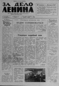 Пролетарии всех стран, соединяйтесь! Д Е Л О Орган Сев ер но г о райкома К П С С и районного Совета депутатов трудящихся Новосибирской области В полете — „Еосмос-724“ 7 а п р е л я 1 9 7 5 г о д а в С о в е т с к о м С о ю з е п р о и з в е д е н з а п у с к о ч е р е д н о г о и с к у с с т в е н н о г о с п у т н и к а З ё м л и « К о с м о с - 7 2 4 » - Н а б о р т у с п у т н и к а у с т а н о в л е н а н а у ч н а я а п п а р а т у р а , п р е д н а з н а ч е н н а я д л я п р о д о л ж е н и я и с с л е д о в а н и й к о с м и ч е с к о г о п р о с т р а н с т в а - У с т а н о в л е н н а я а п п а р а т у р а р а б о т а е т н о р м а л ь н о К о о р д и н а ц и о н н о - в ы ч и с л и т е л ь н ы й ц е н т р в е д е т о б р а б о т к у п о с т у п а ю щ е й и н ф о р м а ц и и - Т А С С ^ № 45 (4240 ) 12 А П РЕЛ Я 1975 г о д а Газета выходит по вторникам. Цена Год издания 40.Й ------ ------- ----------- С У Б Б О Т А четвергам и субботам 2 коп. 12 ап р ел я — День космонавтики К о с м о с — н а б л а г о л ю д е й -W --------------------------- Начало великой. космиче- кой э стаф ете пол ожил Юрий Гагарин. 77 исследователей околоземного пространства СССР и США побывали за пределами земли. На какую бы из планет в будущ ем ни ступил человек^ он станет прод олж ателем космической тр ассы, начатой 12 апреля 1961 года. Космонавтика в наши дни активно содействует научно- техническому прогрессу. К о с мос обогащ ает новыми ф у н даментальными знаниями о Вселенной. Но, пож алуй , сильнее всего у б е ж д а ю т людей в полезности познания космоса научные данные, применяемые для удовлетворения н а р о д н о хозяйственных н у ж д землян. Напомним, в частности, о р а боте спутников связи «Молния» и метеорологических «Метеор». Выгоды от использования их равны многим миллионам рублей. В 1974 год у советскими учеными было выведено в космос 95 науч* пых летательных аппаратов. Были запущены 74 спутника серии «Космос», 2 орбитальные научные станции типа «Салют», три пилотируемых многоцелевых корабля серии «Союз». Стартовали 2 автоматические станции типа «Лупа». К этому надо.д обавить 5 метеорологических с п у т ников «Метеор», 7 спутников связи типа «Молния», 2 с п у т ника «Интеркосмос». Растет стремление народов к коллективному изучению и освоению космоса па благо всего человечества. Одним из примеров сл ужи т деятельность «Иптеркосмоса», в которой участвуют ученые социалистических стран, Франции, Ин дии, США. На июль этого г о д а намечен совместный сов етско-американский эксперимент по программе «Союз-Аполлоп». Изв естно высказывание Генерального секретаря ЦК КПСС Л. И. Брежнева о том «чтобы и в космосе, и на земле происходили стыковки человеческих усилий и талан тов, направленных на благо народов!». З а годы космической эры за л ож е н прочный научный ф ундамент для б у дущих важных шагов в космосе. (ТАСС) Сев свеклы заверш ен Николаев. Полеводы хозяйств, расположенных в зоне Ингулец- кой оросительной системы, закончили сев сахарной свеклы. Он проведен в рекордно короткие сроки. Свекловичная нива зд е с ь заняла более девяти тысяч гектаров, на к аж д ом из них п р е д полагается получить не менее 500 центнеров сладких корней. Навстречу весеннему севу Б У Д Е М С О Р Е В Н О В А Т Ь С Я Механизатором я работ аю пятнадцать лет. На севе в прошлом году выполнял по полторы с лишним нормы. Посев принимался бригадиром и агрономом с хорошей оценкой. В сенокос прессовал сено и т б ж е перевыполнял сменную норму. Во время хлебоуборки метал стогоме- 