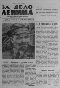 П ролетарии всех стран, с оед иняйтесь ! О р ган С е в е р н о г о р ай ко м а КПСС и р а й о н н о г о Совета де путатов т р у д ящ и х с я Н о в о с и б и р с к о й области Д а з др а в с т в у е т марксизм-ленинизм — вечно ж ив ое р еволю ц и онн о е интернациональн ое учение, знамя борьбы трудящ ихся в с е х стран против и м п е р и а л и з м а , з а п о б е д у с оциализм а и коммунизма! ( Из Призывов ЦК КПСС к 1 Мая 1975 года). № 49 (4244) 22 А П Р Е Л Я 1975 года Газета выходит по в торникам , Цена Год издания 40-й В ТОРНИК ч етвергам и с убботам 2 коп. В. И. Ленин всегда с нами (К 105-й годовщине со дня рож д ен и я ) У инициаторов соревнования Ветераны держат с л о в о В н а ч а л е г о д а б р и г а д ы м е ж к о л х о з н о й с т р о и т е л ь н о й о р г а н и з а ц и и , в о з г л а в л я е м ы е у ч а с т н и к а м и В е л и к о й О т е ч е с т в е н н о й в о й н ы М - П- О с и п о в ы м , Ф . Д . Л о м о в ы м - и Н- Т. Н о в и к о в ы м , в с т а л и на у д а р н у ю т р у д о в у ю в а х т у в ч е с т ь 30 л е т и я П о б е д ы . О н и п р и з в а л и п о с л е д о в а т ь их п р и м е р у б ы в ш и х ф р о н т о в и к о в и в с е # т р у д я щ и х с я р а й о н а . П о д в е д е н ы и т о г и п е р в о г о к в а р т а ла. В о т ч т о о н и п о к а з а л и . Б р и г а д а М и х а и л а П р о к о п ь е в и ч а О с и п о в а с т р о и т н о в ы й у з е л с в я з и . Эта с т р о и т е л ь н а я п л о щ а д к а н а х о д и т с я в ц е н т р е С е в е р н о г о , и р е з у л ь т а т ы т р у д а б р и г а д ы в и д н ы к а ж д о м у - В ы в е д е н ы с т е н ы г а р а ж а на 10 а в т о м о б и л е й , у л о ж е н ы п е р е к р ы т и я , н а ч а л а с ь к л а д к а с т е н с а м о г о а д м и н и с т р а т и в н о г о з д а н и я . О б ъ е м р а б о т с д е л а н на 3 3 6 0 0 р у б л е й в м е с т о п р е д у с м о т р е н н ы х к в а р т а л ь н ы м п л а н о м 30 т ы с я ч . Ф е д о р Д м и т р и е в и ч Л о м о в в м е с т е с о с в о е й б р и г а д о й , с о с т о я щ е й из ч е т ы р е х ч е л о в е к , т р у д и т с я на п и л о р а м е - Е го б р и г а д а к в а р т а л ь н о е з а д а н и е в ы п о л н и л а на 164 п р о ц е н т а . Р а с п и л е н о 6 5 0 к у б о м е т р о в д р е в е с и н ы д л я с т о л я р н о г о ц е х а и д р у г и х н у ж д с т р о и т е л ь с т в а , . Б р и г а д и р с т а р а е т с я с д е л а т ь в с е в о з м о ж н о е , ч т о б ы не д о п у с т и т ь п р о с т о е в - Р а н ь ш е п р е д п о л а г а е м о г о с р о к а с п р а в и л а с ь с о б я з а т е л ь с т в а м и б р и г а д а л е с о р у б о в И в а н а Т и х о н о в и ч а Н о в и к о в а - 1500 к у б о м е т р о в д е л о в о й д р е в е с и н ы з а г о т о в л е н ы е щ е к с р е д и н е м а р т а , а Н о в и к о в с о с в о и м и т о в а р и щ а м и с е й ч а с р а б о т а е т на о д н о м и з у ч а с т к о в с т р о я щ е г о с я к и р п и ч н о г о з а в о д а . Д о б р о с о в е с т н о т р у д я т с я на с в о и х м е с т а х и д р у г и е в е т е р а н ы в о й н ы . 150 п р о ц е н т о в к с м е н н о й н о р м е — т а к о в ы р е з у л ь т а т ы р а б о т ы ; с т о л я р а , ч л е н а К П С С И- И. П о л я к о в а - В. Я. М о к р о у с о в о р г а н и з о в а л б р и г а д у и в ы е х а л в к о л х о з и м е н и X X I I с ъ е з д а К ПСС - С е й ч а с б р и г а д а с т р о и т г а р а ж и д в у х к в а р т и р н ы й д о м - В э т о й ж е б р и г а д е — к а м е н щ и к И- И- М а т в е е в ' , в д р у г о й — на с т р о и т е л ь с т в е 1 6 к в а р т и р - ( н о г о д о м а в С е в е р н о м — к а м е н щ и к В- М . П а л и н о в , О н и т а к ж е , к а к и с л е с а р ь И. Н- Б ы к о в , п е р е в ы п о л н я ю т с м е н н ы е н о р м ы , М- К О Х Т Е Н К О В А - В л а д и м и р И л ь и ч Л е н и н (1 8 7 0 1924 ) п о л и т и ч е с к и й д е я т е л ь н о в о г о т и п а , с о з д а т е л ь К о м м у н и с т и ч е с к о й п а р т и и и п е р в о г о в м и р е с о ц и а л и с т и ч е с 