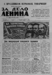 С ПРАЗДНИКОМ ПЕРВОМАЯ, ТОВАРИЩИ! Пролетарии всех стран, соединяйтесь! О р ган С ев ер но го райкома КПСС и р а й о н н о го Совета депутатов т руд ящ и хся Нов оси б и рско й области Да з д р а в с т в у е т . Коммунисти- чеекая~партия Советского Союза —испытанный авангард рабочего класса, всего советского народа! Да з д р а в с т в у е т великое н е р у шимое единство партии и народа! (И з Призывов ЦК КПСС к 1 Мая 1975 г.) № 53 (4248) 1 мая 1975 года Газета выходит по вторникам , Цена Год издания 4 0 . й ЧЕТВЕРГ четверга м и субботам 2 коп. * День международной солирднасоти трудщяисхя Ра й о н у— Красное знамя В д е н ь П е р в о м а я н а д в се й п л а н е т о й р е ю т алы е з н а м е н а М н о г о м и л л и о н ная а р м и я т р у д я щ и х с я З е м л и о т м е ч а е т д е н ь б о е в о й с о л и д а р н о с т и , д е м о н с т р и р у е т с в о ю с п л о ц е н н о с т ь , с в о ю н е п р е к л о н н у ю в о л ю к б о р ь б е п р о т и в и м п е р и а л и з м а , за м и р , д е м о к р а т и ю и с о ц и а л и з м В п л а м е н и з н а м е н , в г р о м е « о р к е с т р о в , я р к о м у б р а н с т в е г о р о д о в и се л п р и х о д и т П е р в о м а й на н е о б ъ я т н ы е п р о с т о р ы н а ш е й Р о д и н ы В э т о т д е н ь с о в е т с к и й н а р о д р а п о р т у е т о н о в ы х с в е р ш е - Д о с р о ч н о ! Праздник Первомая многие колхозы района встречают д о с рочным выполнением полугодов ого плана поставок государству мяса. Больше чем на два месяца раньше срока планы выполнили колхозы им. XXII с ъ е з д а КПСС, «Восход» , «Новая жизнь», «Путь к коммунизму», «Заветы Ильича». По сравнению с этим ж е периодом прошлого года особенно большой прирост *—от 40 д о 50 процентов — дали колхозы имени XXII с ъ е зд а КПСС и «Новая жизнь». А колхоз «Заветы Ильича» увеличил поставки мяса больше чем в два раза. Полугодовой план поставок мяса в целом по району выполнен на 82 процента. По сравнению с 1974 годом рост с о с т а вил 19,2 процента. н и я х в б о р ь б е за о с у щ е с т в л е н и е р е ш е н и й X X I V с ъ е з д а К ПСС и п ла на за в е р ш а ю щ е г о г о д а п я т и л е т к и , о р е з у л ь т а т а х п р е д м а й с к о г о с о ц и а л и с т и ч е с к о г о с о р е в н о в а н и я Ш и р о к о и с в о б о д н о р а з в е в а ю т с я п е р в о м а й с к и е з н а м е н а н а д к о л о н н а м и д е м о н с т р а н т о в в с т р а н а х с о ц и а л и з м а , г д е П е р в о м а й стал г о с у д а р с т в е н н ы м п р а з д н и к о м п о б е д и в ш е г о ? р а б о ч е г о к л а с с а и всех т р у д я ш . и х - с я П о с т р а н а м к а п и т а л и с т и ч е с к о г о м и р а в. д е н ь П е р в о г о М а я п р о к а т ы в а - II ремни за 1074 год министерство сельского х о зяйства РСФСР и ЦК профсоюза работников сельского х озяйства и заготовок подвели итоги Всероссийского социалистического соревнования колхозов и совхозов республики за 1974 год. За высокие показатели в производстве и поставках г осудар ству зерна, молока и мяса о д но из первых мест присуждено колхозу «Память Ленина» нашего района. Колхозу вручено переходящее Красное знамя Министерства сельокого хозяйства РСФСР и ЦК профсоюза, д е нежная премия в сумме 2300 рублей. Второе место с вручением д е нежной премии в сум м е 1400 рублей присуждено колхозу «Путь к коммунизму», е тся н о в а я м о щ н а я в о л на з а б а с т о в о ч н о г о д в и ж е н и я О н о п р о х о д и т п о д л о з у н г о м б о р ь б ы п р о т и в а г р е с с и в н о й по л и т и к и и м п е р и а л и з м а , п р о т и в б е з р а б о т и ц ы С к а ж д ы м г о д о м р а с т е т ф р о н т к л а с с о в ы х б и т в с и м п е р и а л и з м о м , п о в ы 