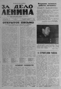Пролетарии всех стран, соединяйтесь! О р ган С е в е р н о го р айкома КПСС и р а й о н н о г о Совета депутатов тр у д ящ и х с я Н о в о с и б и р с к о й области № Г>0 (4255) 17 мая 1975 года Газета выходит по вторникам , Цена Год издания 4 0 . й СУББОТА ч етвергам и с убботам 2 коп. О Т К Р Ы Т О Е П И С Ь М О окружным избирательным комиссиям по выборам в Верховные Советы союзных р е сп уб л и к Мы, члены Центр ального Комитета КПСС, п о лучили от коллективов предприятий, колхозов, совхозов, учреждений- учебных заведений, воинских частей, а т а к ж е от ок р уж ны х п редвы бор ных совещаний избирате лей тел еграммы и письма, в кото рых они сообщают о .выдвижении нас кандидатами в депутаты Верховных Советов с о юзных республик по р яд у избирате льных о к р у гов и просят д а ть согласие баллотиров ать ся по этим округам. В ы р а ж а е м сердечную б лагодарность и п р и з нательность ("рабочим, колхозникам, инженерно- техническим работникам, служ ащим , воинам А р мии и Флота, всем • избирателям, выдвинувшим нас канди да там и в деп утаты Верховных Советов союзных республик. Высокую честь и о к а з ан но е нам доверие мы полностью относим на счет н а шей великой ленинской партии и рас см атриваем это доверие к а к свидетельство всенародной поддержки ее 'внутренней и внешней политики, ие- . преклонной решимости тру д ящ и х ся пашей с т р а ны выполнить и перевыполнить за д ан и я 1975 года и пятилетки в целом, ознаменовать прёд- стоящий XXV съ езд Коммунистической партии Советского Союза новыми достижениями в т р у де во имя процветания и укрепления могущества нашей социалистической Родины. Поскольку к а ж д ы й из нас может б а л л о т и р о ваться только в одном избирательном округе, Центр альный Комитет КПСС рекомендовал нам д ать согласие б аллотиров ать ся в 'следующ их из- пзбирательных округах по выборам в Верховные Советы союзных республик: Брежнев Л. И. — Б ауманский избирательный округ, гор. Москва, РСФСР . Андропов Ю. В. — Новомосков ский и з б и р а тельный округ,—Тульская .облас ть , РСФСР . Гречко А. А. — Пролетарский избирательный округ, гор. Ростов -на-Дону , РСФСР . Гришин В. В. — Вешняковскнй избирательный округ, гор. Москва, РСФСР. Громыко А. А. — Калининградский и зби р а тельный округ, Московская область, РСФСР . Кириленко А. П. — Политехнический и з б и р а тельный округ, ю р . Ленинград , РСФСР . Косыгин Н. А. — Фрунзенский избирательный БРЕЖНЕВ Л. И. АНДРОПОВ Ю. В. ГРЕЧКО А. А. ГРИШИН В. В. ГРОМЫКО А. А. КИРИЛЕНКО Д. П. КОСЫГИН А. Н. КУЛАКОВ Ф. Д. КУНАЕВ Д. А. МАЗУРОВ К. Т. ПЕЛЬШЕ А. Я. ПОДГОРНЫЙ Н. В. ПОЛЯНСКИЙ д . с. СУСЛОВ М. А. округ, гор. Москва , РСФСР . Кулаков Ф. Д . — Нижнеломовский и з б и р а тельный округ, Пензе нская область, РСФСР, Кунаев Д . А. — Б ак ан асс ки й избирательный округ, Алма-Атинская область , К а з а х с к а я ССР. Мазуров К. Т. — Василеостровский и зб и р а : тельный округ, гор. Л ен и нгр ад , РСФСР. Пельше А. Я. — Краснооктябрьский избирательный округ, гор. Волгоград, РСФСР. Подгорный Н. В. — Ленинградский и з б и р а тельный округ, гор. Москва , РСФСР. Полянский Д. С. — Павловский и зб и р а т е л ь ный округ, Алтайский край, РСФСР. Суслов М. А. — Автозаводской и зби р а т е л ь ный округ, гор. Тольятти, Куйбышевская о б ласть, РСФСР. Щербицкий В. В. — Баглейский и зб и р а т е л ь ный округ, Днепропетров ск ая область, Украинская ССР. Демичев П. Н. — Ленинский избирательный округ, гор. Ярославль, РСФСР . М