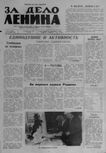 Пролетарии всех стран, соединяйтесь ! З А Д Е Л О Орган Северного райкома КП СС и районного Совета депутатов трудящихся Новосибирской области № 73 (4268) Год издания 40-й 18 июня 1975 года С РЕДА Газета выходит по вторникам, четвергам и субботам Цена 2 коп. В ПОЛЕТЕ „ В Е Н Е Р А - 1 0 “ В соответствии с программой исслед ования космического про странства и планет Солнечной системы 14 июня 1975 года в Советском Союзе осуществлен запуск автоматической станции «Венер а - 10». Полет д ву х автоматических станций позволит получить более полные данные о планете Венера, а т а к ж е о физических процессах, протекающих в космическом пространстве. Станция «Вейера-10» с т а р т о в а л а с промежуто чной орбиты искусственного спутника Земли и в 7 часов 30 минут московского времени вышла на межпланетную гелиоцентрическую траекторию полета. Параметры траекто рии движения станции близки к р а с четным. Управление полетом станций «Венера-9» и «Венёра-10» осущ ест вляетс я из центра дальн ей космической связи. Бортовые системы и а п п а р а т у р а ав тома тичес ких станций ф у н к ционируют нормально. Посту пающая с борта и нформация о б р а б а ты в а е т с я к оорд и национно-вычислительным центром. Автоматическая ст анция «Венера-10», к а к и станция «Венера-9», достигнет окрестности планеты в о к тя бр е 1975 года. ЕДИНОДУШИЕ И АКТИВНОСТЬ ИЗБРАНЫ ЕДИНОГЛАСНО Дружно, организованно прошли выборы в Остяцке- Первым на избирательный участок пришел престарелый житель нашего села Евсей Петрович Гдамаздин- Он пожелал избранникам народа, депутатам в Верховный Совет РСФСР и местные Советы, плодотворно трудиться для блага народа и во имя мира на земле. При голосовании выступили с речами тракторист С. Д. Пронин, рабочий А. Е- Макаркин, пенсионерка Е. Я. Гламаздина. К 12 часам дня почти все избиратели выполнили свой гражданский долг- Праздничная обстановка в селе подчеркивалась и убранством зала, где проходило голосование, и нарядной одеждой людей. В Доме культуры был продемонстрирован кинофильм, работали магазины,. Но на полях и в этот день не прекращались посевные работы- К механизаторам, к пастухам, ■которые с гуртами скота находились на выпасах, члены избирательной комиссии . выезжали с передвижной урнойВсе кандидаты блока коммунистов и беспартийных получили сто процентов голосов своих избирателей. В- СТРЕЛЬЦОВА. Сообщения по телефону 15 июня — день выборов трудящиеся района встретили как большой праздник, праздник советской демократии- Сотки рабочих, колхозников, представителей интеллигенции встретили этот праздник отличными показателями в труде- Вот что, например, сообщили из Ново-Тро- ицка, Доярки М. И. Семенова, Е. Л. Шуляёва и И. М. Середа обещались ко дню выборов надоить по своим группам коров по 200 центнеров молока- К 15 июня они сдержали свое слово: каждая из них надоила от 207 до 2 1 3 центнеровКандидат в депутаты областного Совета доярка колхоза «Па" мять Ленина» Ольга Петровна Южанина брала обязательство: к 15 июня надоить по 12 центнеров молока на корову. Фактически она надоила по 12 ,4 центнера. Доярка колхоза им- М- Горького, кандидат в депутаты районного Совета Р. П. Квашнина обещала к дню выборов надоить по 13 центнеров на корову. Сло-' во она с честью сдержала, Таких примеров множество. .-■В 6 утра все 24 избирательных участка района открыли свои двери, и председатели участковых комисси