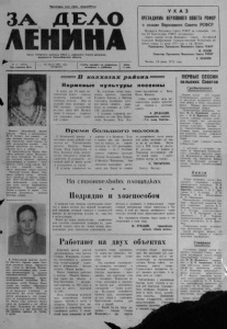 О р г а н С е в е р н о г о р а й к о м а К П С С и р а й о н н о го Совета депутатов тру д ящ их с я Н ов ос и б ир с кой области № 77 (4272) 26 июня 1975 года Газета выходит по вторникам , Ц е н а Год издания 40-й Ч Е Т В Е Р Г ч е т в е р г ам и субботам 2 коп. У К А З ПРЕЗИДИУМА ВЕРХОВНОГО СОВЕТА РСФСР о созыве Верховного Совета РСФСР Президиум Верховного Совета РСФСР на основании статьи 39 Конституции РСФСР постановляет: созвать первую сессию Верховного Совета Российской Советской Федеративной Социалистической Республики девятого’ созыва 15 июля 1 97 5 года в гор. Москве. Председатель Президиума Верховного Совета РСФСР М. ясное Секретарь Президиума Верховного Совета РСФСР X. НЕШНОВ. Москва, 19 июня 1 97 5 года. Д о я р к а Веселовской фермы колхоза «Путь к коммунизму» М. И. Буевич (на снимке) за пять месяцев получила от к а ж дой первотелки своей группы по 2238 килограммов молока. Это лучший р е з у л ь т а т не только в колхозе , но и в районе. В животноводстве Мария Ивановна р а б о та е т давно. Несколько лет была свинаркой. Из года в год получала хороший приплод, о т к а р м л и в а л а и с д а в а л а госуд а р с тв у сотни голов свиней. Когд а ст а л а д о яр к о й ,— тож е в числе передовых людей колхоза . Прошлой осенью Мария И в ановна н а б р а л а группу нетелей. Гурт пригнали из Биазы, ж и в о т ные были малорослые, истощенные. За ботли вы й уход сделал свое дело: нетели выровнялись , поправились . Начался растел. Сейчас в группе 14 коров. Старательно р а з д а и в а л а ка ж д ую опытная д о яр к а . В Чебахов ской бригаде колхоза «Восход* хорошо знают большую д р уж н ую семью Афанасьевых. Г л а в а ее, Василий Федорович, зар е к о м е н д о в а л себя отличным м еханизатором , з а высокие производственные достижения н а гр аж де н несколькими прави тельственными наград ам и . Мать восьмерых детей, Полина Никол аев н а (н а снимке ), обременена домашними заботам и. Постоянно ей трудить ся в колхозе не приходится. Но когда п р е д с т а в ляется возможность , он а у х а ж и в а е т з а новорожденными т е л я т а ми. Нынче тож е набира ет группу таких ж е малышей, в ней сейчас 20 телят. Телятница не допусти ла п а д еж а и в ма е получила по 620 грамм ов привеса на голову в сутки. — ------ JB х е о л х о з а х р а й о н а = К о р м о в ы е н у л ь т у р ы п о с е я н ы К концу дня 20 июня механизаторы нашего колхоза полностью завершили сев кормовых культур. Овес на зеленый корм размещен на 6 8 0 гектарах, подсолнечник на силос занял 4 0 0 . Посеяли также 9 гектаров турнепса для подкормки коров глубокой осенью. В Чебаковской бригаде в настоящее время дойный гурт пасется на Тахтаметовеких выпасах. Пастухи Демьян Рудиш, Илья Горносталев и Петр Ратников очень добросовестно относятся к своим обязанностям. В результате суточный удой,по ферме достиг 9 килограммов на корову. , К лучшему изменилось поНа подготовке почвы выделялись агрегаты Анатолия Кузьмича Ковгана и Виктора Сергеевича Доленчука, которые довели сменную выработку на лущении до 1 1 0 — 120 процентов. С большим старанием потрудились на севе Петр Кириллович Мосиявич, Петр Осиложение и в Витинске. Если в первые дни, как выгнали скот на выпаса, на корову получали по 5,8 килограмма, то теперь — по 7. Особенно хочется отметить пастухов Леонтия Васильевича Блинова и Михаила Черепанова. Они аккуратно выполняют распорядок дня. Коров на стоянке пович Харлампович и Иван Ильич Миньков. Сейчас основные с