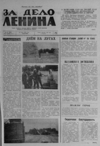 Првлетарии всех стран, соединяйтесь! Орган Северного райкома КП СС и районного Совета депутатов трудящихся Новосибирской области О ДЕЛЁГАЦЙИ СССР НА ^ГРЕТИН ЭТАП СОВЕЩАНИЯ ПО БЕЗОПАСНОСТИ И СОТРУДНИЧЕСТВУ В ЕВРОПЕ ЦК КПСС, Президиум Верховного Совета СССР, Совет Министров СССР назначили д еле гац ию СССР на третий этап Совещания по безопасности и сотрудн и честву в Европе в следующем составе: Генеральный секретарь ЦК КПСС Л. И. Брежнев — глава делегации; член политбюро ЦК КПСС, министр иностранных дел СССР А. А. Громыко — заместитель главы делегации; член ЦК КПСС К. У. Черненко и з а меститель министра иностранных дел СССР А. Г. Ковалев — члены делегации, ТАСС № 90 (4285 ) 29 июля 1975 года Газета выходит три раза Цена Год издания 41-й ВТОРНИК в неделю 2 коп. ДНЁМ Н А Л У Г А Х Ранним утром, по росе, лишь только солнце шагнет лучами по крышам домов, начинается рабочий день у механизаторов колхоза «Заветы Ильича». До того, как обсохнут валки сгребенного сена, надо'подготовить технику, чтобы потом весь день она работала безотказно. Дни стоят солнечные, жаркие. Трава сохнет быстро. День— два . и можно .вести- е е ' уборку. Времени терять нельзя: не успеешь оглянуться, подоспеют другие сельскохозяйственные работыПеред обедом из деревни выехала автомашина. Сегодня на полевом стане будет идти торговля. Продавец дежурного магазина Полина Сергеевна Косолапова привезла для механизаторов сигареты, коржики, пирозй- ки, лимонад, беляши, рыбные консервы. Торговля в поле, на лугах постоянно практикуется Ново-Троицким торговым объединенном. Его работники — желанные люди у полеводов. Механизаторы работают вдали от села. В оборудованном под жилье вагончике они отдыхают в обеденных перерывах, в непогоду. Колхоз организовал горячее питание, нашлась женщина- повар— Надежда Федоровна Храбрая. — Продуктами снабжают хорошо,— рассказала она.— Все есть: и крупы, и жиры, и картошка, и приправа разная. Мясо не выводится. Людей кормим сытно. (Механизаторы подтверждают это). Но трудно с хлебом. Последние два дня его вообще не было. А если и* есть, то зачастую несвежий, черствый- Обидно даже предлагать его уставшему человеку. Постоянных едоков ‘у Надежды Федоровны не очень много. Но иногда ее «семья» резко увеличивается: на помощь механизаторам идут служащие учреждений, домохозяйки. Па воскресники, как. обычно, собираются учителя, медики, работники сельсовета, культуры. Вот и на сей раз человек двадцать сельчан приехало. Обед короток. Вот уже ушли женщины, некоторые механизаторы. Вот-вот должно подъехать механизированное ■звено. Им поставлено; как сообщил помощник учетчика комсомолец Федя Петров, более 2 5 0 0 центнеров сена — 83 процента из общего количества корма, заготовленного бригадой. Трактористы подъехали. Вновь стало шумно на полевом стане. Шутки, смех сняли усталость. В звене, в основном механизаторы, чей многолетний опыт явился основой успешного выполнения ежесменных заданий. Пусть это будет Анатолий Степаненко или агрегат Ивана Сучилина — каждый стремился перевыполнить норму. Четкая, слаженная работа всех бригад, звеньев, каждого механизатора приближает день выполнения плана заготовки сена. На верхнем снимке: Есть еще скирда! Федя Петров производит ее обмер; хорошо освежиться в минуты отдыха холодным лимонадом- (средний снимок); обед кончился- Работа продолжае