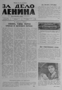Пролетарии всех с тран , соединяйтесь! З А Д Е Л О Орган Северного райкома КП СС и районного Совета депутатов трудящихся Новосибирской области № 112 (4307) Год издания 41-й 16 сентября 1975 года ВТОРНИК Газета выходит три раза в неделю Цена 2 коп. В р а й к о м е К П С С Л УСИЛИТЬ ТЕМПЫ УБОРКИ УРОЖАЙ г Бюро р ай кома КПСС, рассматривая вопрос об. у с и л е н и и тем пов у б о р к и у р о ж а я и за го т о в о к кормов, отметило, что областное совещание па р т и й н о - х о з я й с т ве нного а к т и в а по с та ви л о в к а честве в а ж н е й ш е й задачу перед п а р т и й н ы м и , с о в е т с к и м и , х о з я й с т в е н н ы м и , профсоюзными и ко м с о м о л ь с ки м и о р га н и з а ц и я м и — п о вы ш е н и е темпо в у бороч н ы х работ, п р одаж и зерна г о с у дарс тву и з а го тов о к ко рм о в . Несмотря на с л о ж ны е погодные у сл овия , в н е к о т о р ы х к о л х о з а х района вы ращен сравнительно н епл охой у р о ж а й . По 11 це н т -, неров -зерна с г е к т а р а намола ч и в аю т в ко л х о з а х «П ам ять Лен и н а » , «Заве ты И л ь и ч а » . В целом по р а й о н у у р о ж а й н о с т ь з ер н ов ы х составляет по 9 , 2 це нтнера, с и л о с н ы х — по 1 2 6 центнеров с г е к т а р а . В настоящее время о р га н и з о ванное проведение у б о р к и у р о - J- ж а я и з а го т о в о к кормов должно быть особой заботой районной п а р т и й н о й о р га н иза ци и - к а ж д о г о т р у ж е н и к а района . Дело чес ти п а р т и й н ы х , с о в е т с к и х , х о з я й с т в е н н ы х , з а г о т о в и т е л ь н ы х орга нов, р у ков од ите л е й и с п е ц и а листов ко л х о з ов , всех земледельцев — в к о р о т к и е с р о к и , с в ы с о к и м качес твом у брать в ы р ащ е н н ы й у р о ж а й , в ы п о л н и т ь п л а н ы и п р и н я ты е с о ц и а л и с ти - »■ ч ес ки е обязательства п.о продаже хлеба, го с у д а р с т в у , полно стью з а с ы п а т ь семена, з а с к и р довать всю солому, в с п а х а т ь зябьЦ К КПСС и Совет М и ни с тр ов СССР вы делил и Н ов оси б ир с ко й области д опол нительны е ма те риально - т е х н и ч е с к и е р есур сы , что я в л я е т с я новым п р о я в л е н и ем заботы п а р т и и и п р ав и те л ь ства о т р у ж е н и к а х села, о дальнейшем подъеме с е л ь с к о го х о зя й с т в а . Наш район п о л у ч и л 1 1 0 автомобилей, на уб орке у р о ж а я , работает 1 9 2 рабочих п р о м ы ш л е н н ы х п р е д п р и я т и й города Нов оси б ир с ка . Для у с п е ш н о го проведения И ЗАГОТОВКИ у б о р к и у р о ж а я в сж а т ы е ■ ср о ки и без потерь необходимы ч е т к а я о р г а н и з а т о р с к а я и массово - п о л и т и ч е с к а я работа п а р т и й н ы х о р г а н и з а ц и й , с л а ж е н н о с т ь в р а боте всех звеньев . у п р а в л е н и я с е л ь с к о х о з я й с т в е н н ы м пр о и з в о д ством, в ы с о к а я ли чн ая о тв етс твенность р у ков од ите л е й и с п е циалис тов с е л ь с к о го хо зя й с тв а за о р га н и з а ц и ю у б о р о ч н ы х р а - J 5 ° T, трудовое н а п р я ж е н и е на всех у ч а с т к а х уборочной с т р а ды. Б ол ьш ую помощь кол хо зам в проведении у б о р к и у р о ж а я п р и з в а ны о ка з а т ь п р омыш л енны е , т р а н с п о р т н ы е пр ед п р и я т и я , у ч реждения т ор го в л и , бы та , мед и ц и н ы , к у л ь т у р ы . Бюро р а й к о м а . КПСС обеспоко ено тем, что в к о л х о з а х « 7 - й съезд Советов», « П у т ь к к о м м у н и з м у » , « В осхо д » , имени К Маркса у бо р к а ведется кр а й н е н и з к и м и т ем п а м и ,1 неуд овл етво рительно и с п о л ь з у е т с я т р а н спо рт , силосные г г зерновые ко мбайны п р о с та и в аю т , а час ть их вообще не вк л ю ч е н а , к работ у , пл а н з а с ы п к и семян п е ре х о дяще