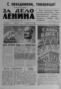 1 С праздником, товарищ и ! Пролетарии всех стран, соединяйтесь! З А Д Е Л О Ор ган Северного райкома К П С С и районного С о ве т а тр уд ящ и хся Новосибирской облас ти д е п у та то в П о д знаменем маркс и з м а - л е н и н и з м а , п о д руководством Коммунистической партии — вперед к п о б е д е коммунизма! ( И з П р и зы в о в Ц К К П С С ) -----------% ---------- № Год 133 (4328 ) издания 41-й 7 ноября 1975 года П Я Т Н И Ц А Г а з е т а выходи т три раза в неделю Ц е н а 2 к о п , - * * ДЕЛО ОКТЯБРЯ ЖИВЕТ И ТОРЖЕСТВУЕТ ■В октябре- 1917 год а рабочие и крестьяне Ро ссии, возглавляемые партией Лен и н а , взяли власть в свои руки и создали первое в мире гос уд а р с тв о тр у д я щ и х с я . В е л и кая О к т я б р ь с к а я социалистическая революция о к а з а л а глубокое воздействие на весь ход мирового развития , открыв эп ох у перехода от к а пи тали зм а к социализму и ук аз ав путь народам к миру и прогрессу. С о в е т с к а я стр ан а под р уководством Коммунистической партий за 58 л е т прошла большой п у т ь борьбы и со зидан ия, о сущ ествляя идеалы О к т я б р я . Тяжелым и спытанием для С тр аны Сове тов яв и лась В елика я Отечественная война, иго советский парод отстоял свободу и независимость своей Родины. , Торжественно отметили советские люди в этом г о д у т р и д цатилетие Победы в Великой О т е чественной войне. Ныне С о в е т с к а я д ержава дости гла передовых рубежей социально - экономите с к о г о и к у льтурно го прогресса. В нашей с тране созд ано общество р азви то го социализма, у с п е ш но ос ущ ес т в ля е тся с троительство коммунизма. З а в е рш а е т с я д евя тая пя тилетка. Замечательные плоды приносит патриотическое движение за выполнение и перевыполнение заданий пятилетки . Коммуни стическая п артия идет к своему очередному, X X V съезду, который определит дальнейшие перспективы страны, главные н а правления новой, десятой п я т и л е т ки. Сове тский народ, вся паша с тр а н а готовится в с тр е ти т ь это замечательное событие новыми трудовыми успехами. С о в е т с к а я с трана неу клонно о с у ще ствляе т полити ку мира и д р у ж бы между народами. О т ленинско го Д е к р е т а о мире до Программы мира, выдвинутой X X I V съездом К П С С , — т ако в славный п у т ь с о ветской внешней политики. Р а з р я д ка напряженности , позитивные сдвиги в советско-американских отношениях с о зд а л а условия для проведения В|июле э то г о года первого международного космического полета « С о ю з - 19» и «Аполлон», что с вид е тель с твуе т о широких возм ожностях со тр удниче ства различных с тр а н в интересах мира и прогресса всего человечества. Идеи О к т я б р я изменили о б лик нашей планеты. П о д зн ам е нем О к т я б р я вместе с советским народом ид у т ныне пароды с тр а н мировой системы социализма — славно го детища м ежд ународно го рабочего к л а с с а . Д е л о О к т я бря живет и т о р ж е с т в у е т в и с т о рических завоеваниях междуна-' родного коммунис тического дви жения, в успешной борьбе н а р о дов за национальное и со циал ьное освобождение. Идеи м ар ксизма- ленинизма, под з н ам ен ем - которых победил О к т я б р ь , все более и более овлад еваю т умами и сердцами миллионов л ю д е й . в о всех у г о л к а х земли, п обуж дая их к революционной и освободительной борьбе, к борьбе за мир и социальный прогресс. ЕСТЬ ГОДОВОЙ ! Соревнуясь за достойную в с т речу 58-й годовщины Великого О к т яб р я , животноводы ряда колхозов района добились от