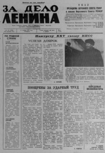 П р о ле та ри и всех с тр а н , с о е ди н я йте с ь ! Орган Северного ра йкома КПСС и районного Совета д е п у т а т о в тр у д ящ и х ся Новосиби рской обл асти У К А З ПРЕЗИДИУМА ВЕРХОВНОГО СОВЕТА РСФСР о с о з ы в е В е р х о в н о г о С о в е т а Р С Ф С Р Президиум Верховного Совета РСФСР постановляет: Созвать втЬрую сессию Верховного Совета Р о с с и й ский Советской Федеративной Социалистической Р е с публики девятого созыва 10 декабря 1975 года в гор. Москве. П р е д с е д а т е л ь П р е з и д и у м а В ер хов ного С овета Р С Ф С Р м. я с н о в Секретарь П р е з и д и у м а В ер х о в но го С овета Р С Ф С Р X. Н ЕШ К О В № 135 ( 4 3 3 0 ) 13 ноября 1975 года Газета выходит три раза Москва, 6 ноября 1975 года. Цена Год издания 41-й Ч ЕТВЕРГ в неделю 2 коп. ПО РОДНОЙ СТРАНЕ СТАЛИ ПЯТИТЫСЯЧНЙЦАМИ Тбилиси. Среди л у ч ших ж и в о т н о в о д о в Гру,- зии, со р е вн ующ и х ся за д о с т о й н у ю в с тре ч у X X V съ е зд а КПСС, са м ы х вы соких р е зул ь тат о в до сти гла д оя р к а Гагр- с к о г о племенног о с о в х о з а Тамара . Улез ько. Н ад о й молока оТ к а ж дой из 25 к ор ов она д ов ел а дц 5283 килограмм ов . Пятитысячни - цами стали и ее п о д р у ги Екатерина Лешева, Нино Турманидзе, Е в гения Ю р к о в а . АЛТАЙСКИЕ ‘ ЭЛЕКТРОЛИНИИ Барнаул . Свыше 22 тысяч килом етров в ы с ок ов ол ьтны х и низк оволь тных . линий в в е ли в эк сп л у а та цию за пятилетку м ех ан и зи р о ванные колонны тре- " ста «А л т ай се л ь эл е к т р о - с е т ь с т р о й » . З аверш ено п я т и л е т н е е ' задание. Теперь надежной э н е р гией п оль зу ю т ся п о д а вл яющ ее б о л ьши нс тво хо зяй с т в . ТУВИНСКИЕ ЗАКАЗНИКИ Кызыл. На а в т о м о бильных д о р о г а х Тувы - появились знаки с из обр аж ен ием л е сн о г о красавца — марала. Они п р е д у п р е ж д а ю т в о дителя, ч т о надо с н и зить с к о р о с т ь , быть, о с о б е н н о внимательным там, где о бы ч но м а р а лы, косули, лоси, к а б а ны п ерех од я т д о р о г и . Сейчас т е рр и т о р ию Тувы нас еляет бо лее 80 ви дов м л е к о п и т аю щих . В Туве ' насчиты вается д ев я ть з ак а зн и ков с общ е й т е р р и т о рией почти 500 тысяч гектаров. ОБОГАЩЕНИЕ КОРМОВ Минск. К выпуск у а гр е гат о в для п ри го товления б е л к о в о г о к о н центрата приступил коллектив Б а р а н о в и ч с к о г о к ом б и н ата с е - наж ных башен. Они б у д у т и с п о л ь з о в а т ь с я на крупных о т к о р м о ч ных комплекса х. В н о вый агр егат з а с ы п аю т см е сь , с о с т о я щ у ю из ячменя, минеральных д о б а в о к , льносемян , и о б р а б а т ы в а ю т п о д д а в л е нием 12 а тм о сф е р при высокой темп ературе . П о л у ч а е т с я ко нцентрат, в к а ж д о м килограмме к о т о р о г о с о д е р ж и т с я д о 600 гра мм ов прот еина. УСПЕХИ Чем ближе дата созыва очередного партийного съезда- тем активнее включаются животноН воды колхоза «7-й съезд Советов» в соревнование за его достойную встречу. Растет в хозяйстве число передовых доярок и скотников. Особенно высокий накал соревнования среди животноводов; Останинскощ фермы. Здесь каждый стремится выполнять свое дело по-хозяйски- В коровниках чисто и сухо. На ферме установлено круглосуточное дежурство скотников. Они постоянно очищают помещения, помогают дояркам раздавать корма, выгоняют животных на прогулку. Все стремятся не допустить снижения надоев молока. Многие доярки добились хороших трудовых успехов- Например, А. Ф. /Геплинская за десять месяцев выполнила годовое обязательотД О Я Р О К во — надоила 2240 килограммов молока! на каждую фураж- ную кор