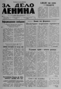 Пролетарии всех стран , соединяйтесь! Д Е Л О Орган Северного райкома КПСС и районного Совета деп у та то в трудящихся Новосибирской области ^ 5.08.00 тон хлопка — государству Труженики сельского хозяйства Узбекской ССР, претворяя в жизнь решения XXIV съезда КПСС, в трудных усло виях маловодья вы р а стили хороший урожай, организованно провели уборку и успешно выполнили народнохозяйственный план завершаюдарству хлопка. Колхо зы и совхозы республики доставили на з а г о т о вительные пункты 5 м ил лионов тонн хлопка-сы р ца, что на 280 тысяч тонн больше, чем намечалось народнохозяйствен н ы м планом. Впервые в республике заготовлено 236 тысяч тонн хлопка ценных тонковолокнистых № 144 (43 3 9 ) 3 декабря 1975 года. Газе та выходит три раза Цена летки по прод аже госу- сортов. Год издания 41-й С Р Е Д А в неделю 2 коп. Зима на ф ерм ах = = Получают хорошие привесы Информационное собщнеие о Плен ум е Ц ентрального К омитета Коммунистической партии к Советского С о ю з а 1 декабря 1 9 7 5 года состоялся Пленум Центрального Комитета Коммунистической партии Советского Союза. Пленум заслушал доклад Генерального секретаря ЦК КПСС тов Брежнева JI. И. о вопросах очередного XXV съезда КПСС. Пленум принял соответствующее постановление. Пленум заслушал доклады заместителя Председателя Совета Министров СССР, председателя Госплана СССР тов. Байбакова Н. К «О Государ1. Утвердить следующий порядок дня очередного XXV съезда КПСС: 1) Отчет Центрального Ком и т е т а КПСС, и очередные з а дачи партии в области внутренней и внешней политики докладчик Генеральный секретарь ЦК КПСС тов. Брежнев Л. И 2 ) Отчет Центральной ре визионной комиссии КПСС — докладчик председатель ревизионной комиссии тов. Сизов Г. Ф. 3) Основные направления развития народного хозяйства СССР на 1 9 7 6 - 1 9 8 0 го- ■^ы — докладчик Председатель Совета Министров СССР тов. Косыгин А. Н. 4 ) Выборы центральных органов партии. 2. Установить норму представительства на XXV съезд КПСС: один делегат от ' 3 0 0 0 членов партии3. Делегаты на XXV съезд КПСС избираются согласно Уставу партии закрытым (тайным) голосованием на Одобрить в основном проекты Государственного плана развития народного хозяйства СССР на 1976 год и IV ственном плане развития н а родного хозяйства СССР на 1 9 7 6 год» и министра финансов СССР тов. Гарбузова В. Ф. «О Государственном бюджете СССР на 1 97 6 год». На Пленуме выступил с большой речью Генеральный секретарь ЦК КПСС товарищ Брежнев Л. И. Пленум ЦК КПСС принял по этим вопросам соответствующее постановление. На этом Пленум ЦК КПСС закончил свою работу. областных, краевых партийных конференциях и съездах компартий союзных республик. Выборы делегатов на съезд КПСС от компартий Украины, Белоруссии, Узбекистана и Казахстана производятся на областных партийных конференцияхКоммунисты, состоящие в партийных организациях Советской Армии, Военно-Морского Флота, внутренних и пограничных войск, избирают делегатов на XXV съезд КПСС вместе с соответствующими территориальными партийными организациями на областных, краевых партконференциях или съездах компартий союзных республик, Коммунисты, состоящие в партийных организациях ч а стей Советской Армии и Военно-Морского Флота, находящихся за границей, избирают делегатов на XXV съезд КПСС на партийных конференциях соответствующих войсковых соединений. сударственного бюджета СС