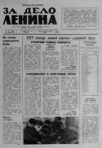 Пролетарии «сех стран, соединяйтесь! З А ДЕ Л О Орган Северного райкома КПСС и районного Совета трудящихся Новосибирской области депутатов Д е с я т а я пятилетка — новый важный этап в создании материально-т ехнической базы коммунизма, совершенствовании общественных отнош е ний и формировании нового человека, развитии социалистического о б р а з а жизни. Это период усиления интенсификации общ ественного производства, б о л е е полного использования в о зм о ж н о стей народного х о зя й с т в а для приумнож ения национального богатства, укрепления экономического могущества и о б о р о н осп особн ос ти страны. (И з Проекта ЦК КПСС к XXV с ъ е з д у партии «Основные направления развития народного х о з я й ства СССР на 1976— 1980 г о ды » ) . № 155 (4350) 27 цекабря 1975 года СУББОТА Газета выходит три раза Цена Год издания 41-й в неделю 2 коп. Н а съ езде X X V с ъ е з д у н а ш е й п а р т и и — у д а р н ы й т р у д К у б ы Гавана. (ТАСС ). Съездом п о бедителей, штурмующих новые, высоты в борьбе за счастливое бу д ущ е е своей родины. назвал форум кубинских коммунистов Генеральный секретарь Ц К КПСС Л . И. Б реж нев . Первый с ъ е з д Коммунистической партии Кубы четко определил стратегическое направл ение развития К у бинской революции на современном этапе: п родолжать социалистическое строительство вплоть до построения • социализма — первой фазы коммунистического общества. Съезд подтвердил, что центральное место во внешней политике партии занимает союз с СССР и что К уба б удет и впредь делать все для укрепления социалистического с о д р у ж е ства, равноправным членом к ото рого она является. Важнейшим до кументом с ъ е з да является программная платформа партии. Как говорится в его резолюции, по всем основным вопросам строительства нового общества программная платформа намечает политику, отв ечающую требованиям объективных законов построения и развития коммунистической общественно - ( экономической формации при д*- постоянном учете конкретных у с ловий' ня Кубе и м е ж д у н а р о д ной обстановки. Форум коммунистов одобри л проект новой конституции с о ц и алистической Кубы, который выносится на предстоящий в н а чале 1976 года всенародный р е ферендум , а также проект Д и ректив пятилетнего плана с о ц и ально - экономического развития страны (1976-1980 г г . ) Как на главную цель ближайшего пятилетия в этой об ласти в д о к у менте указывается на н е о б х о д и мость наращивания темпов индустриализации. f Съ е зд принял т а к ж е Устав партии и одобрил ряд других резолюций. В ра б о т е с ъ е з д а прцнцмдда участие делегация КПСС во гл а ве с членом Политбюро ЦК КПСС секретарем ЦК КПСС М. А. Сусловым. УСКОРИМ ТЕМПЫ РЕМОНТА На днях мы провели партийное собрание с повесткой дня — «Задачи партийной организации по своевременной подготовке техники к весенне - полевым работам». Такой вопрос возник сам по себе, так как в хозяйстве ремонт техники идет очень ни зкими темпами. Коммунисты отметили хорошую работу тракториста, а теперь слесаря по ремонту сельскохозяйственных машин, Ивана Максимовича Мосиявича, Он один отремонтировал более восьмидесяти борон и несколько л у щильников. Если бы была ВЕ С Н Е Н А В С Т Р Е Ч У создана специальная ремонтная бригада, то подготовка техники подходила бы к концу. В основном, конечно, машинно-тракторный парк в исправном состоянии. У нас готовы к работе 7 лущил