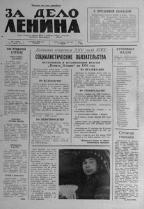 Пр ол ет ар ии всех с тр а н , соединяйтесь! З А Д Е Л О Орган Северного райкома КПСС и районного Совета депутатов трудящихся Новосибирской области № 5 (4356 ) Год издания 41-й 10 января 1976 года СУББОТА Газета выходит три раза в неделю Цена 2 коп. С ТРУДОВОЙ ПОБЕДОЙ Центральный Комитет К П С С и Совет Министров Союза С С Р поздравили с трудовой победой коллективы рабочих, инженерно-технических работников и сл уж ащ и х производственного объединения «Звезда» и Минского автомобильного завода с успешным выполнением заданий девятой пятилетки по объему промышленного производства, выпуску основных видов продукции и росту производительности труда . Ц К К П С С и Совет Министров С С С Р пожелали коллективам этих предприятий дальнейших трудовых успехов в деле повышения экономической мощи нашей Родины, достойной встречи X X V съезда партии. ПО РОДНОЙ СТРАНЕ НОВОСТРОЙКИЗДРАВНИЦЫ Д ост ойн о встретим X X V с ъезд КПСС СОЦИАЛИСТИЧЕСКИЕ ОБЯЗАТЕЛЬСТВА СУТОЧНЫЕ НАДОИ молока на к ор ов у по м о л о ч нотоварным фермам на 6 янва { ря 1976 г. (в килограммах) В «Л есной поляне» — с а натории Пятигорска — н о в о селье: строители передали в распоряжение курортников новый девятиэтажный корпус. И теперь санаторий о дн ов р е менно мож ет 'принимать на лечение почти тысячу человек. Сегодняшняя новостройка открывает список пусковых объек тов Пятигорска, которые б у д у т введены в действие в десятой пятилетке. В городе- курорте заложены фундаменты здравниц «Р одни к», «С тав рополь е ». «Труженик» ТЕПЕРЬ — НА ПОТОК Ждановский з ав о д т я ж е л о го ^машиностроения начал се рийный выпуск железн одо рожных цистерн облегченного веса. Вагон для перевозки нефти и бензина весит на 800 килограммов меньше выпускавшихся ранее. Из металла сэкономленного на п рои зв од стве таких цистерн, предприятие см о ж е т изготавливать в год 240 «хранилищ на колес а х » . ЗАЖГЛИСЬ ГОЛУБЫЕ ЭКРАНЫ З а ж г л и с ь ^ гол убые экраны во многих отдаленных селах Алтая. Новые телеретрансляторы вступили в строй в районных центрах Мамон т ово Шебалино и Усть-Кане. Передачи из Мос квы и Барнаула см отрят чабаны и лесорубы прителецких горных урочищ и хлеборобы дальних поселков -Ч степной Кулупды. АВТОМОБИЛЬ В ШАХТЕ В Кавалеров о Примор ск о го края на руднике «Ц ен тральный» в качестве р у д о воза в подземных горных выработках используется а в томобиль марки СТ-2Б. Он избавил горняков от укладки сотен метров рельсо в о г о полотна, заменил несколько погрузочных машин десятки вагонеток. ' П р о и з в о дительность труда п роходчи ков с применением э той машины возра стает в три раза. ФИЛЬМ 0 К0РЗАЛАН2 Документально - публицистическая лента «С ердце Кор- валана» создана на студии «М осфильм». Она рас сказывает о жизни и б о р ь б е Генерального секретаря Коммунистической партии Чили Луиса Корвалана, его н е сг и б а ем ом ' му ж е с тв е и героизме. Автор фильма — лауреат Ленинской премии кинорежиссер Р. Кармен. Г JACC к о л х о з н и к о в и м е х а н и з а т о р о в к о л х о з а „ П а м я т ь Л е н и н а " на 1976 г о д Отвечая на заботу нашей партии и Советского правительства, мы, колхозники и механизаторы колхоза «Память Ленина», принимаем на 1970 год следующие социалистические обязательства: НО ПОЛЕВОДСТВУ Посеять зерновых культур 5200 гектаров, получить урожайность по 15 центнеров е гектара и валовой сбор зерна — 7.800 тонн. Продать зерна государств