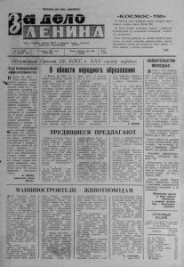Пролетарии всех стран, соединяйтесь! i l C V I U Орган Северного райкома КПСС и районного Совета депутатов трудящихся Новосибирской области « К О С М О С - 7 9 0 » В Советском Союзе произведен за п у с к очередного и с к у с ственного спутни ка Земли «К о с м о с - 7 9 0 » , На борту спу тни к а установлена научная аппаратура, предназначенная для продолжения исследований космического пространства. Кроме научной аппаратуры, на спутнике имеются: радиосистема для точного измерения элементов орбиты, радиоте- леметрическая система для передачи на Землю данных о № 12 (4363) 27 января 1976 года Газета выходит три раза Ц е н а Т А С С . Год издания 41-й ВТОРНИК в неделю 2 коп. Обсуждаем Проект Ц К КПСС к съезду п а рт и и народного ", Для повышения эффективности D Проекте ЦК К П С С к съезду партии довольно .п одробн о говорится о развис н и автомобильной промыш ленности. Думаю, все с удовлетворением восприняли наметки о том, что в десятой пятилетке увеличится производство всех видов тр анспортных средств. Б у д у т продолжены работы по дальнейшему повышению надежности и увеличению ресурса машин, снижению трудоемкости их обслуживания. Я обратил внимание на такую фразу: «Осуществить комплекс мероприятий, н а правленных на усиление ответственности отрасли за обеспечение автомобильного -’ арка запасными частями», ^ П о - м о е м у , для осуществления этого важного комплекса -.мер нужно заинтересовать автомобилестроителей и т р ак торостроителей в производстве запасных частей. На мой взгляд, необходимо в кол хозы и совхозы, расположенные в зоне неблагоприятных погодных условий, поставлять всю сельскохозяйственную т е хни ку , особенно автомобили, повышенной проходимости и с комплектом запасных частей. Это позволит эффективнее, использовать технику. В. Д Р А Г А Н , председатель колхоза «Восход». В области В Проекте Ц К КПСС «Основные направления развития' народного хозяйства на 1 9 7 6 — 1 9 8 0 годы» есть такая строка: «Развивать и совершенствовать всеобщее среднее образование». Это — совершенно необходимое требование. Без среднего образования уже сейчас, а тем более в будущем не может быть знающего рабочего, колхо зника. Потому что, во-первых. образованный человек — более сознательный, дисциплинированный, во-вторых, техника все усложняется , расширяется автоматизация, и малограмотный человек не может управлять этой техГлавный бухгалтер колхоз а «Новая жизнь» С. И. Александров, секретарь партбюро колхоза им. М. Горького Г, Е. Аденский и главный з о отехник колхоза «7-й съ езд Советов» М. Е. Окунев внесли предложение о том, чтобы в Сибири расширить работы по осушению болот под се нокосы и пастбища, увеличить на это ас сигнования и поставки соответствующей техники, * * * Е, В. Коростелев •— з а в е дующий столярным цехом быткомбината и 3. А, Ч и к у - лаев а — за в едующа я швейным цехом считают, что необходимо больше обратить внимания на бытКомб'инаты швкой, умело ее использовать. А что у нас происходит на практике? Юноши и дев уш ки, в большинстве своем и в большинстве сельских школ, оканчивая 8 классов, у езж а ют в города, чтобы за два года (за те, которые они могли бы у чи т ь с я в 9 - 1 0 классах) в т ехнических и других училищах получить специальность, профессию. Это хорошо. Но только в том случае, если училище дает среднее образование. К сожалению, многие училища стра- • ны (профтехнические, д