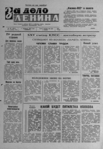 Пролетарии всех с т р а н , с о ед иняйтесь ! „К о см о с -8 0 2 “ в полете 11 ф евр а ля 1976 года в Советском Союзе произведен запуск очередного искусственного спутника ’ Земли «Космос-802». На борту спутника установлена научная аппаратура , предназначенная для продолжения исследований космического пространства. Кроме научной аппаратуры, на спутнике имеются: радиосистема для точного измерения элементов орбиты, радиотелеметрическая система д л я передачи на Землю данных о работе приборов и научной аппаратуры. Орган Северного райкома КПСС и районного Совета трудящихся Новосибирской области депутатов Установленная на спутнике аппаратура работает нормально. Координационно-вычислительный центр ведет № 20 (4371) 14 февраля 1976 года Газета выходит три раза Цена (ТАСС). Год издания 41-й СУББОТА в неделю 2 коп. П о р о д н о й с т р а н е Для весенних полей ЦЕЛИНОГРАД. (Казахская ССР). Соревнуясь з а достой- - ную встречу XXV съ е з д а партии, коллектив «Целиноград- сельмаша» решил ко дню открытия съезда выпустить сверх плана 40 разбрасывателей минеральных удобрений, 10 лущильников, на несколько тысяч рублей запасных частей, сэкономить 2 0 0 тысяч киловатт-часов и в день открытия XXV съ езд а работать йа сбереженной электроэнергии. одна лечь МАИЛИ-САИ (Киргизская ССР). На Майли-Сайском электроламповом заводе вступила в строй новая печь для варки хрусталя. С вводом ее в действие в полтора раза увеличился выпуск хрусталь ных рассеивателей света. Возрос и ассортимент изделий. Коллектив участка на . трудовой вахте в честь XXV съезда партии довел суточную выработку этих изделий до 22 ,;5 тысячи штук. Морозов не боится ОМСК. На Омском нефтеперерабатывающем комбинате получена первая опытно - промышленная партия двух новых северных сортов , моторных масел. Один из них предназначен для дизелей буровых установок, другой — для карбюраторных автомобильных двигателей. Новые масла обеспечивают легкий запуск, моторов даже в самые суровые морозы, не образуют нагары и осадки. Первые сотни тонн новой продукции отправлены в северные районы для промышленных испытаний. Новостройки животноводства ВОРОНЕЖ. В канун нынешнего года в колхозе имени Ильича Калачеевского района Воронежской области вступил в строй молочный комплекс на 560 дойных коров. Впрочем, это первая его очередь. В нынешней пятилетке п р е д - . приятие будет отстроено полностью' и примет 2 , 2 0 0 животных. Преимущества нового комплекса велики. Полная механизация всех процессов позволяет втрое повысить производительность труда. К аждая доярка - оператор обслуживает теперь сто коров. В нынешнем году в Калачеевском районе будет сооружено еще три молочных комплекса, а всего за пятилетку — девять. Меха- низированнные предприятия по производству молока сооружаются во всех районах области. Нынче их 34,, а к концу пятилетки число молочных фабрик возрастет до 185. X X V о т ъ е з д у К П С С — д о с т о й н у ю С О О БЩ АЮ Т И З КО ЛХО ЗА «ПАМЯТЬ ЛЕНИНА» ЧЕЛОВЕК СЛАВЕН ТРУДОМ Коллектив Больше - Куликовской бригады достиг в завершающем году д евя той пятилетки неплохих результатов. Успешно за в е р шен план по объему производства всех видов "сельскохозяйственной продукции. Люди проявляют творческую инициативу. Особенно широкий размах приняло трудовое соперничество в связи с подготовкой к очередному съ езду партии. Оно уже принесло свои пло