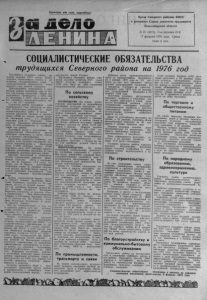 Пролетарии всех стран, соединяйтесь! 1 1 0 / 1 V Орган Северного райкома К П С С и районного Совета депутатов трудящихся Новосибирской области № 21 (4372). Г о д издания 41-й 17 февраля 1976 года . Среда Цена 2 коп. СОЦИАЛИСТИЧЕСКИЕ ОБЯЗАТЕЛЬСТВА трудящихся Северного района на 1976 го д Т рудящи еся Северного района, выполняя решения X X I V съез да КПСС добились определенных успехов в вы полнении госу д ар ственн ог о плана и социалистических обя за тель ств завер шающ его года девятой пятилетки. Промышленные предприятия и организации района выполнили план по о б ъ ему реализации продукции. О бъ ем про мышленного производства в 1 9 7 5 году по сравнению с 1 9 7 4 годом в о з р о с на р* 8 , 3 процента, производительность тру да — на 16 ,7 процента. Стр оители района выполнили план за верш ающего года пятилетки по о б ъ е мам капитальных вложений -и ст р ои тельно-монтажных работ. В целом в девятой пятилетке введены в эк сплуа тацию 1 2 0 0 0 кв. метров жилой площади, кирпичный завод в с. Северном, выполнен план по с е л ь с к о м у ст р ои тельству. Проведены значительные рабо ты по бл а г о у ст р ой с т в у и телефони зации сел района. Достойный вклад в выполнение с о циалистических обя за те л ь ств внесли работники транспорта и связи, торгов ли и б ы то в о г о обслуживания. Труженики с е л ь с к о г о х о зя й ст в а вы полнили план продажи г о с у д а р с т в у продуктов ж ивотноводства и обеспечили сдачу 1 1 4 0 9 1 центнера молока, 1 7 5 9 5 центнеров мяса, 4 1 , 6 центнера шерсти, добились увеличения поголовья и продуктивности крупного ро га то го скота . Вы соки х показателей в социалисти ческом соревновании добились животноводы колхоз ов « П у т ь к к оммунизм у » , ИМ. М. Г орького , «7-й с ъ е з д С о в е т о в » , им. К. Маркса, выполнившие пятилетние планы по продаже г о с у д а р ству молока. Высокие надои молок а получили работники А л е к с е е в с к о й , Сур- ф е рм СК° Й’ *“"еверно^ молочнотоварных Щ Доярка А л е к с е е в с к ой фермы к о л хо за «П амя ть Ленина» Валентина Ф ед о товна Черношвец получила по 3 6 ценз о в молока от каждой к оровы . По 2 9 — 3 0 центнеров надоили доярки Мария Ивановна Буев ич и Валентина Марковна Ситникова из к олхоз а «П у т ь к к ом м ун и зм у» , Зоя Константиновна Чернова и Степанида Петровна Легаче- ва из колхоза им. М. Г орьк ого , А г р а фена Федоровна Плотникова и з ’ к о л х о за « П а м я т ь Ленина». Все э т о с в и д етель ств ует о том , что в иолхозах района о с т ь все условия , У чтобы получать в средн ем на ‘ корову не менее 21 — 22 цен тнеров молока иметь высокие привесы. Новый политический и трудовой подъем в коллективах тру дящ и х ся вызвали постановление ЦК КПСС « О социалистическом сорев новании по до- стойной встрече X X V с ъ е з д а партии» . Проект ЦК КПСС к X X V с ъ е з д у партии «О сн о в ны е направления развития народного хозяйства С С С Р на 1 9 7 6 — 1 9 8 0 г о д ы » , постановление ЦК КПСС Совета Министров С С С Р , ВЦСПС и ЦК ВЛКСМ « О В с е с о ю з н о м соц иали стическом сорев новании за повышение эффективности производства и к ач е ст ва раб оты , за успешное выполнение народнохозяйственного плана на 19 7 6 г о д » . П ередовые коллективы,, рабочие и колхозники намечают новые высокие рубежи, принимают встречные планы и о бя за тель ств а на 1 9 7 6 год, первый год д есятой пятилетки, пятилетки э ф ф е к тивности и качества. Сельские труженики видят в этих док ум ен тах проявление за б оты партии и прави