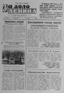 Пролетарии всех стран, соединяйтесь! .11 « 7 / 1 U Орган Северного райкома КПСС и районного Совета депутатов трудящихся Новосибирской области № 24 (4375 ) Год издания 41-й | 24 февраля 1976 года Газета выходит три раза 1 ВТОРНИК в неделю 1 Ц е н а 2 к о п . 24 февраля 1975 года, в столице нашей Родины н а ч а л свою работу XXV-й съезд Коммунистической партии Советского Союза. Трудящиеся Северного района встречают форум партии новыми трудовыми достижениями. Информационное сообщение О Пленуме Докладываем съезду партии Т Р У Д О В Ы Е Р А П О Р Т Коллектива Северного леспромхоза февраля 1 9 7 6 года состоялся Пленум Центрального Комитета. Коммунистической партии Советского Союза. Пленум рассмотрел Отчет Центрального Комитета КПСС XXV съезду Коммунистической партии Советского Союза. С докладом по этому вопросу на Пленуме выступил Генеральный секретарь ЦК КПСС тов. Брежнев Л. И. Пленум единогласно утвердил Отчет Центрального Комитета XXV съезду Коммунистической партии -'Советского ЦК КПСС г Пленум рассмотрел также проект доклада XXV съезду КПСС «Основные направления развития народного хозяйства СССР на 1 9 7 6 - 1 9 8 0 годы». С докладом по этому вопросу выступил Председатель Совета Министров СССР тов. Косыгин А. Н. Пленум единогласно утвердил доклад «Основные направления развития народного хозяйства СССР на 1 9 7 6 - 1 9 8 0 годы». На этом Пленум ЦК КПСС закончил свою работу. Дорогие товарищи делегаты! Мы, труженики Северного леспромхоза, горячо приветствуем вас, участников форума коммунистов, шлем сердечные поздравления и желаем больших успехов в плодотворной работе на благо процветания нашей великой Родины, во имя прогресса всего человечества. Встав на предсъездовскую трудовую вахту, наш коллектив брал обязательство — досрочно, к 24 февраля выполнить план двух месяцев по заготовке и реализации деловой древесины. Рады доложить, что наш ■ коллектив свое слово сдержал: 23 февраля, в канун открытия XXV съезда, выполнен годовой план по заготовке древесины на 1 0 6 ,4 процента, реализовано продукции на 5 5 0 ты сяч рублей при плане 2 8 8 , 5 тысячи. Сегодня, в день открытия съезда, мьГ работаем в счет 1 9 7 7 года. Воодушевленные величественными планами экономического развития нашей страны, мы, труженики Северного леспромхоза, обязуемся задание десятой пятилетки выполнить за четыре с половиной года. Совершенствуя организацию производства и улучшая использование резервов, ежегодно будем повышать производительность труда не менее чем на 8 -1 0 процентов. Заверяем съезд родной партии, что каждый из нас приложит все силы, знания и опыт для выполнения его решений. Союза. В Ц е н тр а л ь н о й ревизионной комиссии К П С С 20 ф е вр а л я 1976 года состоялось заседание Центральной ревизионной комиссии КПСС, на котором был утвержден отчетный доклад комиссии XXV съезду Коммунистической партии Советскогб Союза. По по руч ению коллектива рапорт подписали: В. Л У Ш О В — директор леспромхоза. П. В А С И Л Ь Е В — секретарь партийной организации. Н. РЯЗАНОВ — председатель месткома профсоюза. П. ЕФ РЕМОВА — рабочая пилорамного цеха. В. ДИГИН, А. Е Р О Х И Н , Ф. Ш И Н Д Я Й К И Н — трантористы. Москва. Вид на Кремль и Красную площадь. Фото В. Егорова и А. Стужина (Фотохроника ТАСС) СЛОВО МОЛОДЕЖИ Комсомольцы района — активные участники Ленинского зачета «Р ешения XXIV съ е зд а КПСС — в жизнь!». Своим трудом, общественной а