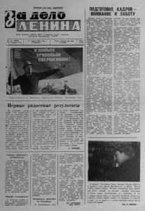 П р ол е т ар ии всех с т р а н , с оединяйтесь ! Орган Северного райкома К П С С и районного Совета де путатов т р у д ящ и х с я Новосибирской области № 3 2 (4382 ) 1 13 марта 1976 года Газета выходит три раза Цена Год издания 41-й 1 СУББОТА в неделю 2 коп. «V Плакат художника Б. Березовского. Издат ельство «Плакат» . Фотохроника ТАСС. П е р в ы е р а д о с т н ы е р е з у л ь т а т ы Два прошедших месяца первого ' года десятой пятилетки для коллектива Северного лесхоза явились первым и удачным шагом в выполнении планов и обязательств 1976 гбда. Успех прежде всего заключается в том. что рост производительности труда превышает рост заработной платы, что положительно сказывается на экономике предприятия. Появилась возможность расширить свою материальную базу, начать строительство предусмотренного планом развития лесхоза единого комплекса, в который войдет пожарно-химическая станция, гараж, стоянка для многочисленной техники, контора и прочее. Строительство должно начаться в этом году. Значительно перевыполнен план двух месяцев по реализации и товарности: продукции. Товаров народного -потребления выпущено на 4,6 тысячи рублей больше, чем предусматривалось заданием. Перевыполнение коснулось и такой статьи, как изготовление продукции из отходов производства. Только в феврале ее было реализовано на две тысячи шестьсот рублей. Если же касаться ассортимента -продукции, то и тут успех сопутствовал коллективу: ассортиментный план выдержан, в основном и по количеству, и по качеству, и по номенклатуре. На 74 кубометра больше задания заготовлено пиломатериалов, потребитель получил 2 4 5 , 8 тысячи штук штукатурной драни, вместо 180 тысяч плановых, перевыполнен выпуск штакетника. Отличный результат и по заготовке древесины по народнохозяйственному плану. За февраль ее заготовлено 3 0 0 кубометров, что в полтора раза больше задания. А. АРКАДЬЕВ. Товары народного потребления Океанские сухогрузы — основная продукция Ленинградского завода имени А. А. Жданова. Но важное значение придают в коллективе и выпуску товаров народного потребления. Для этого на предприятии организован специальный уч асток, где начат выпуск полированных платяных шкафов. Большим спросом у покупателей -пользуются также комплекты для прихожей. Корабелы нынче намерены вдвое увеличить их выпуск. В десятой пятилетке на заводе будет выпущено различной мебели на 15 миллионов рублей. Фирма плодородия В Молдавии создано научно - производстве и н о е объединение «Плодородие». Сфера его деятельности — I научные исследования по почвоведению и агрохимии и их внедрение в практику хозяйств республики. «Плодородие» — восьмое в республике научно- производственное о б ъ е ди нение в области сельского хозяйства. Комментируя этот факт, министр сельского хозяйства Молдавской ССР И. Н. Бережной ск а за л корреспонд е н т у ТАСС: — В докладе Л. И. Б р еж нева на XXV съезде КПСС подчеркивается: «Практи ческое внедрение новых научных идей — это сегодня не менее в ажная зад ача, чем их разработка» . Эти слова как н е л ь з я более точно выражают смысл создания в республике научно-производственных объединений. «Новичок» работает з а четверых На Новосибирском заводе «Тяжстанкогидропресс» имени А. И. Ефремова з а пущен в серийное производство тяж елы й комбинированный продольно-обрабатывающий станок. * У «новичка» мйЬго специал