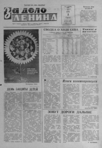 Пролетарии* всех стран, соединяйтесь! Орган Северного райкома К П С С и районного С о в е т а д е п у т а т о в трудящи х ся Новосибирской ооласти Год издания 41-й 1976 нюнь 2 Среда № 66 (44 16 ) Цена 2 коп. Начался сбор подписей Москва. В Советском Союзе началась кампания по сбору подписей под новым Стокгольмским воззванием за прекращение гонки вооружений, з а разоружение., Сбор подписей, как сообщили в Советском Комитете защиты мира, будет проходить в основном в июне- июле. Фотохроника ТАСС Д Е Н Ь ■ЗАЩ ИТЫ Д Е Т Е Й Юное поколение — это завтрашний день человечества, его надежда и б у д ущ е е . . Через четыре года после окончания второй мировой войны Международная демократическая федерация женщин провозгласила 1 нюня днем мобилизации и консолидации сил всех людей доброй воли в общей борьбе в защиту детей от угрозы войны, голода и болезнен, за улучшение - их воспитания и образования, за то, чтобы они никогда болыло не знали лишений и горя. Основатель Коммунистической партии Советского государства великий Ленин теснейшим образом связывал борьбу за социализм с заботой о счастливой доле всех детей. Молодая Советская Р е с публика с первых дней Октября окружила заботой и любовью подрастающее поколение, Самая передовая в мире советская система охраны материнства и детства стала образцом воспитания юного поколения. Она обеспечивает женщинам возможность сочетать материнство с общественно полезным трудом, а детям условия для гармоничного р а з вития физических и духовных сил. Страна Советов делает все, чтобы вырастить наших детей людьми справедливыми, мужественными, трудолюбивыми, честными и образованными — достойными строителями коммунизма. | Забота о детях явл яе т с я государственным делом во всех странах социалистического содружества, где предусмотрена целая система мер, направленных па оказание , помощи семье в содержании и воспитании детворы. Самое лучшее — Детям. Таков непреложный з а квао . н социалистического общестБольшие социальные перемены происходят ныне и в государствах, освободившихся от колониализма, ставших на путь самостоятельного развитая. , л ^ ? лее четвеРти века назад ООН принял «Декларацию прав ребенка», но в странах капитала «Декларация» остается лишь на бумаге. Здесь миллионы ребят лишены эл е ментарных человеческих прав. Дети подвергаются расовой дискриминации в области образования, не получают доступа к современному медицинскому обслуживанию, страдают от недоедания. Более 40 миллионов детей вынуждены заниматься низкооплачиваемым и вредным для здоровья трудом. Миллионы мальчиков и девочек являются жертвами колониализма, неоколониализма, расизма и ненавистного режима апартеида. Борьба за каждого малыша — это борьба за будущее. Отстоять будущее полуторамиллиардной семьи детей, уберечь их от ужасов войны, вырастить в духе братской солидарности — долг всех народов нашей планеты. СВОДКА О ХОДЕ СЕВА в колхозах района на 24 мая 1976 года (в процентах к плану) К о л х о з ы В с е х я р о в ы х И т . ч . я р о в ы х з е р н о з ы х И з н и х С и л о с н ы е к у л ь т у р ы п ш е н и ц а | о в е с Память Ленина 100 им. XXII съ езд а КПСС 109 Восход 95 Новая жизнь 99 Запеты Ильича 101 им. М. Горького 90 Путь к коммунизму 78 Борьба за мир 88 7-й съезд Советов 103 им. К. Маркса 105 По району 97 105 109 100 77 106 123 , 89 111 123 165 87 147 93 88 100 115 100 117 83 125 119 153 91 104 79 87 73 103 99 100 9 4 . 86 100 100 90 113 100 65 123 100 10