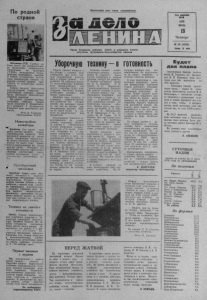 По родной стране Литовская ССР. Удобное р а бочее место для механизаторов, по заключению специалистов оборудовано на тракторах «1- 25А», выпускаемых Владимирским тракторным заводом. В кабине установлены р егул я торы темпера туры, создана н а дежная система защиты тракториста от воздействия агрохимикатов. Кабина создана заводскими конструкторами совместно с работниками кафедры - охраны труда Литовской сельскохозяйственной академии. На снимке: старший научный сотрудник кафедры охраны труда академии Р. Жемайтайте- не и аспирант Г. Куликаускас измеряют шум тракторного дви гателя. Фото В. ГулеБича (Фотохроника ТАСС) Новостройкиэлеваторы Кокчетав. Сто тысяч тонн зерна сможет хранить теперь Тахтабродский элеватор. Этой проектной мощности он достиг после завершения строительства пятого силосного корпуса емкостью 18 тысяч тонн, принятого в эксплуатацию на месяц раньше срока. Ускорить его возведение помогло применение сборных конструкций, укрупненных монтажных узлов и комплексная механизация р а бот. Оренбургский миллиард Оренбург. Цифра один миллиард появилась в журнале диспетчера объединения «Орен- бурггазпром». Столько кубометров топлива добыли и переработали с на чала года газовики Оренбуржья дополнительно к заданию. Уверенно взяв р у беж первого сверхпланового миллиарда, труженики объединения решили выдать до конца года еще столько же кубометров сверпланового топлива. Техника на линейке готовности Минск. Ремонт зерноуборочных комбайнов первыми в Б е лоруссии завершили механизаторы Минсжой области. На линейку готовности поставлено более шести тысяч машин. З а вершается эта работа и в дру- >•'< ' •астях республики. Все агрегаты обеспечены приспособлениями для уборки полеглых и высокостебельных хлебов. Земледельцы республики решили убрать зерновые культуры за 8—-ЛО рабочих дней. П е р в ы е машины с з е р н о м Ош. Автоколонну с зерном нового урож ая — первую в Киргизии принял Карасуйский комбинат хлебопродуктов. Ударнику девятой пятилетки водителю Алимжану Рахманову, возглавившему «красный обоз» колхоза имени Таширова, вручены хлеб-соль и памятный вымпел. В республике на т р а с сах урож а я сейчас работает свыше пяти тысяч автомобилей. По сообщениям корреспондентов ТАСС Пролетарии всех стран, соединяйтесь! Орган Северного райкома КПСС и районного Совета депутатов трудящихся Новосибирской области Г о д н з д а я н я 41 -1 1 9 7 6 И Ю Л Ь 15 Ч е тв ер г № 8 5 ( 4 4 3 5 ) Ц е н а а к о н . Уборочную технику-в готовность Убрать урожай вовремя и без потерь — главная цель хлеборобов. Для этого следует своевременно подготовить к уборке урожая 151 комбайн, 84 рядковых жатки, 71 силосоуброчный комбайн. Есть предположения, что а в г у с т—сентябрь будут дождливыми. Тем более технику необходимо готовить как можно тщательнее. Надежно надо готовить и сушильно - зерноочистительное хозяйство. Но сегодня именно оно вызывает тревогу, так как на многих з е р носушильных пунктах вышли из строя топки. А р е монт их представл яет ряд трудностей. Руководимые чувством ответственности з а судьбу урожая, отдельные хозяйства хорошо и своевременно готовят уборочную технику. В колхозе «7-й съ е зд Советов», например, из 11 зер новых комбайнов — восемь готово к работе, у двух з а канчивается ремонт, один используется на заготовке кормов. Хорошо трудились на ремонте комба