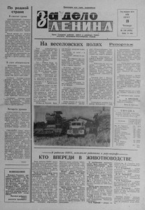 Пролетарии всех стран, соединяйтесь! По р одной стране В сжатые сроки ХМЕЛЬНИЦКИЙ. Отменный урожай собирают нынче зем ледельцы колхоза «Страна Советов» Хмельницкого района. З а логом успеха местных земледельцев явл яе т с я умелое использование новейших достижений науки и передовой практики. Новый прилив сил вызвала инициатива кубанцев по увеличению продажи зерна государству. Хлеборобы колхоза решили приложить все усилия к тому, чтобы в сжатые сроки и без потерь убрать выращенный урожай и отгрузить государству в два р а за больше зерна, чем продавали его раньше. На элеваторы будет доставлено около пяти тысяч тонн хлеба сверх плана. По примеру передовиков увеличивают продажу зерн а государству в других районах области. В счет обязательств ВОРОНЕЖ. Преодолевая трудности, связанные с непогодой, земледел ьцы области настойчиво ведут жатву и продажу зерна государству. На заготови тельные пункты доставлен': свыше 4 0 0 тысяч тонн хлеба. Особенно больших успехов .доби ли сь труженики Кантеми ронского района. Они уже за сыпали в закрома Родины бо- ;чее 50 тысяч тонн зерна из 80 т ц с я ч тонц, взятых по повышенному обязательству. Совхоз «Кр'ммунар», колхозы «Канте- мировский», имени Ленина выполнили свою первую заповедь и продолжают продавать хлеб сверх принятых обязательств. / Усиливают отгрузку хлеба колхозы и совхозы Россошанского, Калачеевского, Аннинского, Лискинского, Острогож ского и других районов. Эстафета урожая НОВОСИБИРСК. Труженики многих совхозов и колхозов об лдсти приртупили к жатве. Р а з ворачиваетсц уборка ржи, овса гороха и основной продовольст венной культуры — пшеницы. С первых дней страды меха низаторы, сл едуя примеру ку банцев, трудятся ударно, и'с пользуют каждый погожий час СМОЛЕНСК. Сотни убороч ных агрегатов в различных рай онах области начали жатву зерновых и теребление льна. Е Ярцевском районе инициаторог, высокопроизводительного ис- ' пользования техники выступил комбайнер совхоза «Михейков- ский» П. Селедцов. Он обязался за сезон намолотить не менее шести тысяч центнеров хлеба. В совхозе «Плосковекий» приступил к работе на плантации один из передовых льноводов Починковского района С. Чепиков. Он решил вытеребить лен за десять дней, собрать до тонны льноволокна с каждого гектара. ТАСС И З В Е Щ Е Н И Е Исполком Северного районного Совета депутатов трудящихся извещает, что 25 августа 1976 года в актовом зале Дома Советов в 2 часа дня состоится врсьмая сессия (15 созыва) Северного районного Совета депутатов трудящихся с повесткой дня: «О плане социально-экономического развития района в свете решений XXV съезда КПСС». Исполком районного Совета депутатов трудящихся. Орган Северного райкома КПСС и районного Совета депутатов трудящихся Новосибирской области Год издания 42-й 1 9 7 6 АВГУСТ 19 Ч е т в е р г № 1 0 0 ( 4 4 5 0 ) Цена 2 коп. Н а Веселовских П О Л Я Х Р е п о р т а ж Идет хлебоуборочная страда. Августовские дни жаркие и сухие, как нельзя лучше способствуют успешному проведению полевых работ. Сейчас ток и поле — основные места, где решается судьба урожая. Ток — в 1»иазе. Сюда, на сушилку, поступает зерно и от веселовских комбайнеров. Здесь, на стене подсобного помещения, прибит голубой щит. На нем красным написано: «Боевой листок», «Молния», «Тревожный сигнал». Это — постоянное место для боевой стенной печати. Директор сельс
