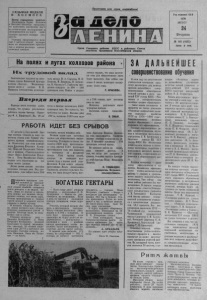 П ролет арии в с е х стран, со единяйтесь! С Е Д Ь М А Я НЕДЕЛЯ В К О С М О С Е Цен тр у п р а в л е н и я полетом. Космонавты Б ори с Волынов и Виталий Жолобов п р о д о л ж а ют вы п о л н я т ь п р о г р а м м у н а у ч н о-технических и сследований и экс п е ри м е н то в н а б ор ту орбит ал ьной научной станции «Са-; лют-5». Успешно п р о д о л ж а е т с я н а ч а тый 7 а в г у с т а второй э к с п е р и мент по вы р ащ ив анию к р и с т а л лов в водном р а с т в о р е а лю м о к а л и е вы х кв асцов. I I Д С г / l U ЕВ LU J Орган Северного райкома КПСС и районного С овета деп утат ов т р у д я щ и х с я Новосибирской области Год издания 42-й 1 9 7 6 АВГУСТ Вторник № 102 ( 4 4 5 2 ) Ц ен а 2 коя. На полях и лугах колхозов района И х т р у д о в о й в к л а д ностью сказать, что план заготовки сена для общественного скота ЗА ДАЛЬНЕЙШЕЕ совершенствование обучения Замечательно трудятся на сеноуборке члены Витинской бригады колхоза «Восход». Механизированное звено в составе П. Н. Мышкина (стогометчик, руководитель звена), И. А. Сергеева, Н. П. Блинова, Н. Ермакова, Н. Антипина, В. Орлова и С. Горбунова ежедневно скирдует по 400 — 500 центнеров сена. Можно с уверенбудет выполнен. Уже сейчас при плане 8 тысяч центнеров заскир- довно более семи. Р. К Р А С Н О В А . Подводя итоги полевых работ, видишь, что лучших результатов добилась первая бригада (бригадир Ф. А. Пфафенрот). На 20 августа в бригаде заготовлено 5600 центнеров сена. Это почти то, что требуется по плану. Посеяно ржи 220 га, заложено 1800 тонн силоса и 25 0 сенажа, идет косовица ржи на свал. Неплохие результаты имеет четвертая бригада. Заготовка кормов продолжается. В . С М Ы К . РАБОТА ИДЕТ Б Е З СРЫВОВ 17 августа в Ургульской бригаде колхоза «Борьба за мир» закончена уборка ржи. Озимые убирались прямым комбайнировани- ем. Отличились при этом комбайнеры Владимир Петрович Бузюр- гин, Николай Васильевич Тебеньков и шоферы «Транссельхозтехники» Павел Дементьевич Похле- бин и Петр Михайлович Узких, больше всех перевезшие на ток зерна нового урожая. Двумя днями раньше посеяны последние гектары ржи. Под урожай нового года пойдет более 250 гектаров, начата вспашка зяби. Полным ходом идет заготовка кормов для общественного животноводства. В скирдах и стогах находится 3 430 цент, прессованного сена, причем 2 14 0 центнеров прессованного сена уже вывезено и находится на фуражном складе. Есть группа людей, которые не покидают колхозные луга с первых дней сенозаготовки. К ним можно отнести прессовщика Павла Алексеевича Санникова, депутата сельского Совета, его сына косаря Сергея, метчика Анатолия Исакова. Заготовка сена продолжается. Скошены первые гектары кукурузы на силос. В траншею заложены 570 центнеров зеленой массы. Не затихает работа на полях, одна сменяет другую. В том, что нигде нет задержек и срывов, большая заслуга бригадира этой бригады Ильи Ивановича Лаврова. И . Г Л А М А З Д И Н , председатель О с т я ц к о г о с ельского Совета . БОГАТЫЕ Г Е К Т А Р Ы По д н я л а с ь к у к у р у з а с т е ной зе л ен ой д а высокой — м е т р а в три. И д ет з а этой стеной комбайн, слыш и т с я ро ко т моторов, а не в и д а т ь ни чего. Л иш ь по з в у к а м и оп р е д е л и т ь можно: вот м аш ин а , н а г р у ж е н н а я отошла, вот вновь з а р а б о т а л и тр а н с п о р т е р ы и п е р вы е горсти колкой и в л аж н о й м ассы у д а р и л и в днище ку з о в а . В к о л х о з е « З а в е т ы И л ьи ч а » , на п о л я х которого и д е т у б ор к а , к у к у р у