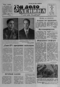 Пролетарии всех стран, соединяйтесь! Ритм страды Как сообщило ЦСУ СССР, на 20 сентября колхозы и совхозы скосили зерновые и зернобобовые культуры (без кукурузы) почти со 112 миллионов гектаров. Это 90 процентов их посевов. Бо- ее чем со 105 миллионов гектаров хлеба обмолочены. Это 94 процента скошеной площади. В целом по стране кукуруза убрана почти на 14 миллионах гектаров. (ТАСС). л1шя X& 0/1U Орган Северного райкома КПСС и районного Совета депутатов трудящихся Новосибирской области Год издания 42-й 1 9 7 8 С Е Н Т Я Б Р Ь 29 Среда № 1 1 7 ( 4 4 6 7 ) Цена 2 вой. ___________ ____ Командир экипажа космического корабля Союз-22» летчик-космонавт СССР,Герой Советского Союза, полковник Валерий Федорович Быковский. Бортинженер космического корабля «Союз-22» Владимир Викторович Аксенов. ФотоВ. Савостьянова и А. Пушкарева (Фотохроника ТАС ) „Союз-22й: программа выполнена 23 сентября 1976 года космический корабль «Союз-22» с экипажем в составе командира корабля Валерия Быковского и бортинженера Владимира Аксенова возвратился на Землю. Задача полета полностью выполнена. Спускаемый аппарат с корабля «Союз-22» совершил мягкую посадку в 10 часов 42 минуты по московскому времени в расчетном районе территорий Советского Союза, в 150 километрах северо-западнее города Целинограда. Самочувствие космонавтов В. Быковского и В. Аксенова хорошее. • • * При исследовании Земли^из космоса применяется много вщ дов аппаратуры. Однако, как показал опыт предыдущих полетов, около 70 процентов информаций, необходимой отраслям народного хозяйства в целях изучения природных ресурсов и защиты окружающей среды, сводится к получению чернобелых и цветных изображений участков земной поверхности. Поэтому при полете «Сою- за-22»существенное внимание было уделено исследованиям эффективности применения и отработке многозональной кадровой фотоаппаратуры МКФ-&, созданной специалистами СССР и ГДР. - Этотвид аппаратуры обладает рядом особенностей и достоинств, важных для решения многих задач изучения Земли из космоса. Так, система снабжена автоматикой, которая в момент съемки делает поправки на скорость полета космического корабля и снимок выходит не «смазанным». Каждый последующий кадр захватывает часть площади, запечатленной на предыдущем. При этом получаются стерескопические изображения, позволяющие определять пространственные характеристики (высоту или глубину) отснятых объектов. Это позволяет, в частно'сти, широко использовать аппаратуру для картографирования земной поверхности. Важно и то, что из нескольких узкоспектральных изображений можно получить высококачественные цветные снимки. Это значительно облегчает возможность распознавания физических свойств изучаемых земных объектов и образований, особенно в области геологии, сельского и лесного хозяйства. Во время полета корабля «Союз-22» был проведен также ряд экспериментов по фотографированию земного горизонта и Луны. Многовнимания экипаж уделил опытам с биологическими объектами. Исследовались особенности развития мальков рыб и высших растений. Полет «Союза-2.2» явился новым важным шагом в изучении природных ресурсов Земли в целях рационального их использования. Г. МАКСИМОВ. ПЕРЕКРЫЛИ ЗАДАНИЯ Исполкомы и депутаты р я да сельских Советов района ведут значительную работу среди населения по закупкам излишков сельхозпродуктов, в част