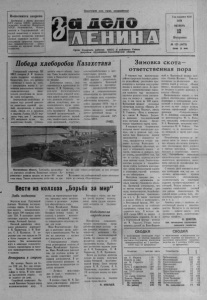 Пополнятся закрома Претворяя в жизнь решения XXV с ъ е з д а КПСС, труженики сельского хозяйства Марийской АСС Р , Андижан ской , Наман- ганской и Сырдарьинской об ластей вырастили в первом год у десятой пятилетки хороший урожай зерновых культур и выполнили принятые повышенные социалистические о б я з а тельства по пр одаж е хлеба гос у дар ству . Пролетарии в сех стран, соединяйтесь! Орган Северного райкома КПСС и районного Совета депутатов тр удящ и хся Новосибирской области Гцд издани я 4 2 - й 1976 ОКТЯБРЬ 12 Вторник № 123 (4 4 7 3 ) Цена Я кон. Победа х л е б о р о б о в Казахстана Генеральный секретарь ЦК КПСС товарищ Л. И. Брежнев горячо поздравил трудящихся Казахстана, всех, кто активно участвовал в борьбе за хлеб, с завершением жатвы и успешным выполнением высоких социалистических обязательств республики по продаже зерна государству. Земледельцы республики в первом году десятой пятилетки вырастили хороший урожай, своевременно, в сжатые сроки, убрали его и засыпали в закрома Родины 1 8 ,3 5 миллиона тонн, или 1 миллиард 120 миллионов пудов, что значительно больше установленного общего объема закупок. Такое'большое количество хлеба в Казахстане заготовлено впервые. Достигнутые успехи, подч еркивается в приветствии товарища Л. И. Брежнева,— это результат последовательного осуществления аграрной политики нашей партии, комплексного развития сельского хозяйства республики, итог самоотверженного труда работников сельского хозяйства, всех трудящихся Казахстана, большой организаторской и политической работы партий*- ных, профсоюзных, комсомольских организаций, советских, сельскохозяйственных и заготовительных органов. Генеральный секретарь ЦК КПСС выразил уверенность, что трудящиеся Казахской ССР выполнят и перевыполнят народнохозяйственные планы » социалистические обязательства по производству и заготовкам всех сельскохозяйственных продуктов, успешно завершат 1976 год в промышленности и других отраслях народного хозяйства, внесут достойный вклад в осуществление решений XXV съезда КПСС. ( Т А С С ) . Кустанайская область. Хлеборобы крупнейше- вал ни один совхоз республики за всю историю го зернового хозяйства Казахстана совхоза «Бу- целины. ревестник» решили продать не менее 80 тысяч На снимке: на хлебоприемный пункт поступает тонн зерна. Такого количества хлеба еще не еда- зерно из совхоза «Буревестник». Вести из к о л х о з а „ Б о р ь б а за м и р “ З я б ь поднята Опустели поля Ургульской бригады. Вспаханы последние гектары пашни. В этом большая заслуга механизаторов. При плане 700 гектаров вспахано 7 5 8 . В настоящее время пахотные агрегаты оказывают помощь Остяцкой бригаде. Высокой выработки ежедневно добиваются коммунист Г. И. Паршуткин, А. И. Пешков, С. Л. Култыгин. В отдельные дни они пахали по 10 и более гектаров на каждый агрегат. Эти механизаторы идут в авангарде социалистического соревнования за высокую производительность труда в колхозе. Ветераны в строю Их четверо. Вместе им более 2 50 лет. Все они ветераны Великой Отечественной войны и труда. И хотя давно на заслуженном отдыхе, но не сидится им дома. Старейший коммунист Василий Павлович Сидоров верен механизаторскому делу. С весны он отремонтировал трактор, принимал самое активное участие в заготовке кормов для общественного стада. Федор Михайлович Мишин — тоже член нашей партии. Бо