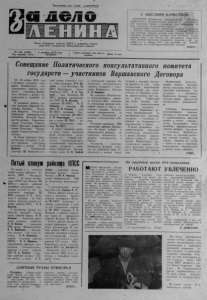 Пролетарии всех стран, соединяйтесь! Орган Северного райкома КПСС и районного Совета депутатов трудящихся Новосибирской области 'v № 144 (4494 ) Год издания 42-й 2 декабря 1976 года ЧЕТВЕРГ Газета выходит три раза в неделю Цена 2 коп. С ВЫСОКИМ КАЧЕСТВОМ ВОРОНЕЖ. Инициатива механизаторов Башкирии , Ивановской и Целиноградской областей по своевременной подготовке машин к весеннему севу подхвачена во цсех хозяйствах Воронежской области. Организованно ведется подготовка техники в колхозах и совхозах Кантемировскою района. Ударным трудом они отмечают каждый рабочий день. Пример другим показывают механизаторы колхоза «Луч Октября» . Сегодняшние дела у них таковы, что они решили выполнить план ремонта тракторов четвертого кв ар тал а к 20 д е кабря, а к 1 ян в ар я 1977 года поставить на линейку готовности все почвообрабатывающие машины. (ТАСС) С овещ ание П олитического консультативного комитета г о с у д а р с т в — уч а ст н и к о в В а р ш а в с к о г о Д о г о в о р а 2 5 — 26 ноября 1 97 6 года в Бухаресте состоялось совещание Политического консультативного комитета государств — участников Варшавского Договора о дружбе, сотрудничестве и взаимной помощи. В совещании приняли участие делегации Народной Республики Болгарии, Венгерской Народной Республики, Германской Демократиизской Республики, Польской Народной Республики, Социалистической Республики Румынии, Союза Советских Социалистических Республик, Чехословацкой Социалистической Республики. От Союза Советских Социалистических Республик в работе совещания участвовала делегация в составе: П. И. Брежнев — Генеральный секретарь ЦК Коммунисмчесской партии Советского 'Союза, глава делегации; А. Н. Ко" сыгин — член Политбюро ЦК КПСС, Председатель Совета Министров СССР; А. А. Громыко — член Политбюро ЦК КПСС, министр иностранных дел СССР; К . Ф. Катушев — секретарь ЦК КПСС; К . У . Черненко — секретарь ЦК КПСС; К , В. Русаков — член ЦК КПСС, помощник Генерального секретаря ЦК КПСС; А. М. Александров — кандидат в члены ЦК КПСС, помощник Генеральногр. секретаря ЦК КПСС. В работе совещания приняли также участие начальник Штаба объединенных вооруженных сил — первый заместитель главнокомандующего объединенными вооруженными силами государств — участников Варшавского Договора генерал a p i p p А. И. Грибков и генеральный секретарь Политического консультативного комитета государств — участников Варшавского Договора Н. П. Фирюбин. На совещании Политического консультативного комитета состоялся обмен мнениями по актуальным вопросам дальнейшей борьбы за мир и углубление разрядки международной напряженности, за укрепление безопасности и развитие сотрудничества я Европе, Участники совещания ПКК единодушно приняли Декларацию «За новые рубежи в международной разрядке, за •укрепление безопасности и развитие сотрудничества в Европе». Государства — . участники Варшавского Договора считают, что укрепление мира, безопасности и доверия между странами и народами отвечало бы принятию на себя всеми государствами, подписавшими Заключительный акт, обязательства не применять первыми ядерного оружия друг против друга. Одобренный ими проект Договора вместе с соответствующим обращением государств — участников Варшавского Договора препровождается на рассмотрение всех остальных государств — участников совещания