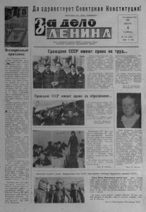 Всенародный праздник День Конституции СССР — большой всенародный празд- н и к в нашей стране. Отмечая еготТТТйетские люди с глубоким удовлетворением видят реальные достижения подлинного народовластия, советской, социалистической демократии, рожденной Великим Октябрем. В единстве- Коммунистической партии и советского народа великая сила нашей демократии, гарантия того, что надежды и чаяния народа воплощаются в реальную действительность. Все для человека, для блага и счастья народа — таков глубочайший смысл и программная цель деятельности партии. В этом суть нашего советского образа жизни, Успехи советского народа в строительстве коммунизма неотделимы от развития социалистической демократии, от - . ш с т и я широких масс в управлении государством. Ныне политические устои нашего государства, ставшего общенародным, прочны, как - н и когда. Неуклонно крепнет и развивается социальное и идейное единство советского общества. В стране утв >рди- лась, стала реальной действи- . тельностыо новая историческая общность людей — советский народ. Коммунистическая партия неуклонно' проводит курс на укрепление и развитие социалистической демократии. За последние .годы расширены полномочия Советов, разнообразнее стали формы и методы их работы, повысилась активность профсоюзов, комсомола, кооперации и других массовый организаций в /Правлении государством. Сегодня все советские люди — наш славный рабочий класс, колхозное крестьянство, наша интеллигенция трудятся над выполи -чием исторических решений XXV съезда КПСС, .с иовьтИГи успехами во всей общественной жизни идут навстречу 60-й годовщине Великого Октября. Советские люди дают высокую оценку внутренней и внешней политике кашей .партии, единодушно одобряют и поддерживают решения октябрьского Пленума ЦК КПСС, практическую деятельность ее . Центрального Комитета, Политбюро во главе с Генеральным секретарем ЦК КПСС Л. И. Брежневым,. Да здравствует Советская Конституция! Орган .Северного райкома КПСС и районного Совета депутатов трудящихся Новосибирской области Год издания 42-й 1 9 7 6 ДЕКАБРЬ 4 Суббота № 145 (4495 ) Цепа 2 коп. Г р а ж д а н е СССР имеют право на т р у д . . . Совхоз имени Крупской Ме- лекесского района — самое крупное зерновое хозяйство Ульяновской области. В этом году совхоз продал государству 204 тысячи центнеров зерна. мелое ведение земледелия позволяет получать стабильные урожаи при разных погодных условиях. З а годы Девятой пятилетки совхоз имел прибыль 8 миллионов рублей. Большие доходы намечает получить хозяйство в десятой пятилетке. Солидную часть их будет давать теперь и животноводство. В совхозе н а чали действовать два новых комплекса: свиноводческий — на 24 тысячи животных, по производству баранины и ш е р сти — на 250 0 овцематок. Шаги уверенного ст ан о вл е ния совхоза хорошо заметны в меняющемся облике его ц е н т ральной усадьбы. З а короткое время здесь вырос большой поселок городского типа. Новой в совхозе ст ала профессия о п е р а тора свиноводческого комплекса. На снимке: передовые р абот ники комплекса (слева направо) — операторы Н. И. Конов алова, В. В. Макеева, начальник цеха откорма Н. Ф. Ермаков а, операторы В. А. Пьянзина, Н. Д. Эврикова. Фото Ю. Бел о зерова (Фотохроника ТАСС) Граждане СССР имеют право на образование. . В Клепиковском районе Р я занской области открылось