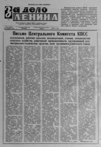 2 i n i i l l l l l l l l l l l l l l l l l l l l l l l i l l ( i l l l i i l l l l i i : i l i i l i i i i i i i i i i i i i i i i i i i t i i i i i i i i i i ! i i i i i i i i i p «ЗА ДЕЛО Л Е Н И Н А » i i i i i i l i l i i l l i i l l i l l l l l l l l l l i l l l l i l l i l i l i . l l 13 января 1 9 7 7 года + № 6 Письмо Центрального Комитета КПСС колхозникам, рабочим совхозов, механизаторам, ученым, специалистам сельского хозяйства, работникам промышленности, поставляющей селу материально-технические средства, всем трудящимся Советского Союза (Окончание. Нач . на 1-й стр.) Центральный Комитет КПСС считает, что сейчас, когда з акл адываю тся основы будущего у рож а я , партийные организации, руководители хозяйств, агрономы бязаны отнестись с особым вниманием к проведению всех мероприятий, обеспечивающих подъем культуры зем л ед ели я , к а к главного условия ро ста эфф ек ти вно сти производства. Повысить ку л ь ту р у з ем л ед ел и я — это значит дополнительно получить большое количество продукции сельского х о з я й ства. В нынешнем году объемы весенних полевых работ з н а чительно.,,, во зрастают. И з - за раннего наступления зимы в р я д е районов страны остались недовыполненными планы зябл евой обработки почвы. Поэтому проведение в ес ен них полевых работ потребует большого напряжения. Руководители, специалисты хозяйств должны все тщат ел ь н о взвесить, с расчетом на худшие условии весньг, уч есть имеющиеся р езервы с тем, чтсбы в короткую весеннюю пору организовать наиболее производительный труд, не допустить ни одного часа потерь. Успех весеннего с е в а во многом будет зависеть от своеврем енной и надежной подготовки техники;. В п е ч а ти было опубликовано письмо башкирских, ц е ли н о г р ад ских и ивановских м ех ан и за торов, которые обратились с призывом ко всем механиза т ор ам страны досрочно и с высоким качеством подготовить к полевым работам всю имеющуюся в х о зя йст вах технику . Этот призыв повсеместно нашел широкую поддержку. Инициаторы соревнования успешно выполняют принятые о б я з а т е л ь с т ва. На линейку готовности уже поставлены все почвообрабатывающие и посевные машины, с опережением у с тановленных сроков ведется ремонт тракторов. Надо сд ел а т ь так, чтобы в каждой республике , крае, области, в каждом колхозе и совхозе, в отделении и бригаде, на предприятиях «Сельхозтехники» были р а з работаны календарные г р а фики подготовки машин к весеннему севу, обеспечены высокие темпы ремонтных работ. Особое внимание должно быть обращено н а к а чество. Лучше дважды, три жды проверить каждую м а шину сейчас, когда еще есть время, чем потом расплачиваться простоями техники, упущенными сроками, потерями урожая. Во всех колхозах и совхозах машинно-тракторные а г регаты должны действовать в две смены. В каждом хо зяйстве нужно з ар ан ее подготовиться к обслуживанию машин на весеннем севе, с о з дать обменный фонд узлов, агрегатов и запасных ч а с тей, привести в готовность стационарные и передвижные пункты технического обслуживания, организовать звенья мастеров-наладчиков, диспетчерскую связь . Словом, сдел ать все, чтобы инжен ерн а я служба работала н а севе, как хорошо о т л а женный механизм. Большую мобилизующую роль в успешном проведении полевых работ сыграет замеч ател ьное движение сельских механизаторов за достижение наивысшей производительности труда, за максимальное использование технических возможностей машин. Несомненно, что это п