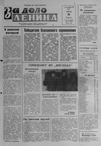 Пролет арии всех стран, соединяйте сь ! Орган Северного райкома КПСС и районного Совета депутатов трудящихся Новосибирской области — Год издания 4 2 - й 1977 Ф Е В Р А Л Ь 24 Четверг № 24 ( 4 5 3 0 ) Цена 2 коп. В ремонтной мастерской С утра до позднего вечера шумно в цехах ремонтной мастерской рай объединения «Сельхозтехника». В сборочном цехе по рельсам плавно перем ещается к р а н -ба лк а : ведется р а з г р у зк а тр ак торных д в и гателей, привезенных из В ерх-Т у. линского рем завода . Их с р а з у же у станавлив аю т на ранее подготовленные рамы т рак торов для окончательной сборки. Через день. д в а двигатели пойдут на обкатку. Приняли двигатели механизаторы Владимир Перцев, трак торис т к о л хоза «Н о в ая жизнь», Николай Первов, тр ак торист колхоза имени М. Горького. В беседе с з а в е д у ющим мастерской В. И. Шульцем выяснилось, что оба механиза тора добросовестно отнеслись к ремонту техники. — С такими, как П е р во з и П е р цев , р а б о т а т ь можно: у них и дисциплина крепк ая, и беспокой ные они. В январ е в мастерские привел свой тр ак то р МТЗ-50 П. И. Хар- лампович, тр акторист колхоза «7-й съ езд Советов». З а четыре года работы машина впервые на ремонте, но ей понадобилась только проверка и регулировка основных узлов и агрегатов. Это говорит о том, что Петр Иоси, фович хорошо следил з а т р а к т о ром, отлично знает пр авил а э к сп луатации техники, любит свою профессию. Но вот иной человек тракторист колхоза «Путь к коммунизму» М. Иванченко. Он и в колхозе пользы мало приносит, и в ремонтной мастерской проку от нею почти никакого. Трактор ДТ-54 пригнал 26 ноября 1976 года. П о ч ти за три ’ месяца не нашел времени произвести ремонт: неделями пьет, не п о является на р а бочем месте. Если же и вдруг появится в мастерской, то целый день ходит без дела. Перед рабочими ремонтной м а стерской «Сельхозтехники» стоят большие задачи . В первом к в а р т ал е текущего года надо отремон тировать 46 тр ак торов, а з а я н в арь было подготовлено всего 14. В феврале в за д е л е 15 машин. Если все они выйдут из м а с т е р ской, то план двух месяцев будет выполнен. Коллектив ремонтной ма стер ской трудится д ружн о и н ап р я женно. Например , с л ес ар ь -сб о р щик по ремонту тр ак торных д в и гателей В. С. Агарков выполняет дневные нормы па 180— 190 про центов. Он не новичок, в совер шенстве зн а е т ремонтное дело, мож ет р а б о т а т ь в высоком темпе и качественно. Хорошим примером служит и Тимофей Филиппович Аверьянов , значительно пер евыполняющий дневные з а д а н и я . В числе передовиков и Г. А. Д олгов, который т а к ж е я в л я е т с я ма стером своего д ела . Отличных р е з у л ь т а тов в т р у д е добив аю тся токари И. А. Кайгородов, А. Е. Ско р о б о гатов. Хорошее ка чество ремонта топливной ап паратуры у сл ес ар я - регулировщика А. М. Кулешова. На электр осв арочных р а б о т а х в мастерской — П. Е. Д овгулев . М еханизаторы колхозов знают, что если сделано Д о вгу л евы м , то сделано прочно, качественно. Д о б рое слово сл ед ует с к а з а т ь и в адрес кузнеца А. Ф. И в ан о в а . Равняй тесь на передовиков! Победители Всесоюзного соревновании Центральный Комитет КПСС, Совет Министров СССР, Всесоюзный Центральный Совет Профессиональных Союзов и Центральный Комитет ВЛ КСМ, рассмотрев итоги социалисти ческого соревнования союзных и автономных республик, краев, областей, национальных округов, городов, районов, колл