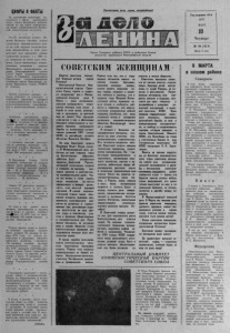 ЦИФРЫ И ФАКТЫ З а достижение наилучших п о к азателей в тр уде соревнуются около сорок а миллионов женщин, многие из них стали и нициаторами новых патриотических начинаний, наставниками молодежи. ♦ * * Готовя достойную встречу 60- летию Великого О к т яб р я , многие труженицы промышленности в з я ли на себя высокие социалистические о б я з а т е л ь с т в а—к этой исторической дате выполнить личные пятилетние з а д а н и я , а к 1980 году заверш ить не менее дву х п я ти леток. Среди инициаторов патриотического начинания — ткачиха .Яковлевского льнокомбината, л а уреа т Государственной премии СССР, Герой Социалистического Труда А. Смирнова, прядильщица Ореховского хлопчатобумажного комбината имени Нико лае вой, д е п у та т Верховного Совета РСФ СР В. Локтева . * * * Тысячи советских женщин у с пешно работаю т на тр а к т о р а х и комбайнах , управляю т новейшей сельскохозяйственной техникой на ав томатизированных птицефабри ках и животноводческих ком плексах. + * ¥ Особенно знач ите льна роль ж е г щ ш в здравоохранении , про- CBCifRnipr, культуре. 7 из к аждых деся ти врачей и учителей д н е в ных и общеобразов ате льны х школ —: женщины. Треть народных с у дей и половина народных з а с е д а телей — женщины. * * ¥ 4 миллиона матерей, многодетны:. и одиноких, получают е ж е месячные пособия. Выплаты на эти цели в 1975 году составили более 380 миллионов рублей. ♦ * * В Верховном Совете СССР женщины составляю т 31 процент общего числа д еп у тато в , в В ер ховных Советах союзных республик — 35, в Верховных Советах автономных республик — 39 и в местных Советах деп утатов т р у дящ и хся — 48 процентов. * * * Свыше 3,5 миллиона женщин— коммунисты. Тысячи из них и з б раны се крета рями первичных п а р тийных организаций, городских и районных комитетов партии, крайкомов и обкомов КПСС. ♦ * * Из года в год рас тет число женщин, обучающихся в с р е дн и ^ специ? аьных и высших учебных' з а г Ц ^ ш я х . . . В 1976 году из ты с я чи женщин 532 имели высшее и среднее образо вание . * * * Р одина высоко ценит и достой но отмечает трудовые заслуги своих дочерей. По данным на я н варь 1976 года, за успехи, д о стигнутые в различных областях народного хо зяй ств а , 1 миллиону 750 тысячам женщин вручены правите льственные награды. „ И з них 4791 женщина удостоен а ^высокого з в ан и я Героя Социалистического Труда. З а высокие д ости жения в т руде 19 женщинам ь 1976 году присвоено зв ание л а у реатов Государственной премии СССР. * * * * Государство п р о я в л я е т постоянную з а б о т у о женщине-матери. Отп уск по беременности и родам продолжительностью 112 дней опла чив аетс я в разм ере полного з а р а б о т к а . Р асходы на эти цели еж егодно сос тавляю т около 1,3 миллиарда рублей. В я с лях и детских с а д а х госу д а р с тв о бер ет на себя дотацию по с одерж аш п о детей в размере 72 процентов. В н астоящее время почти к а ж д ы й третий д ош коль ник ходит в детский сад. В с е ль ской местности в зят курс на о р ганизацию круглогодичных д е т с ких дошкольных учреждений. ( Т А С С ) . Пролетарии всех стран, соединяйтесь! О р г а н Северного райкома К П С С и районного Совета депутатов т руд ящ ихся Новосибирской области Год издания 4 2 й 1977 М А Р Т 10 Ч е тв ер г № 3 0 ( 4 5 Г 6 Ц е н а 2 коп. СОВЕТСКИМ ЖЕНЩИНАМ Дорогие со ве т с к и е ж е н щ и н ы ! Славные дочери нашей О т ч и з ны ! Цен тр ал ьны й К о ми те т К о м м у н и с т и ч е с к о й п а р т и и Советс к о г о Союза г о ря ч 