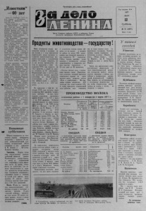 „Известиям** — 60 л е т Одна из старейших га з е т н а . шей страны ■— «Известия» — отмечает в нынешнем году свое 60-летие. Газе та родилас ь в бурные дни февральской революции 1917 года к а к орган Цетро- градского Совета рабочих д е путатов. Вскоре она ст а л а и з данием Центра льного Исполнительного Комитета и П е т р о градского Совета рабочих и солдатских депутатов . Как бесценные документы исторического значения х р а нятся в государственных архи вах, в музеях номера «И зв е с тий», в которых в дни Великого О к тяб р я были опублико ваны первые Декреты Советской власти — Д е к р е т о мире, Д е к р е т о земле. Когда в марте 1918 года Советское правите льство переехало в Москву, номер «Известий», вы шедший в столице, открывался статьей В. И. Ленина « Г л а в ная з а д а ч а наших дней». Будучи массовой, народной газетой, «Известия» являют собой яркое выражение социалистической демократии. На се стр аницах широко о с в ещ а ется деяте льность Советов д е путатов тр удящихся всех с т у пеней, многогранная экономическая и культурная жизнь со юзных и автономных республик. Во всех республиках и крупных областях редакция имеет 60 собственных к о р р е с по нд ен то в . Более полумиллиона писем в год поступает в газету от общественных к о р респондентов и читателей. О т р а ж а я на своих страницах ленинскую миролюбивую внешнюю политику Коммунистической партии и Советского госуд арств а , «Известия» п о ль зу ются влиянием на м е ж д у н а родной политической арене. Сорок ее постоянных к орре спондентов работают в з а р у бежных странах. Газе та «Известия» выходит двум я выпусками: вечером — д ля московских читателей, у т ром — д л я всей страны, ее носьмимиллионный т и р а ж печатается в 44 городах. Воскресное приложение к г аз е те— «Неделя» выходит полутора- миллионным ти ражом , рассчитано па семенное’ чтение. Позывные субботника Широко подхвачена во всех у г о л к а х страны инициатива москвичей — провести 16 ап реля коммунистический суббо тник , посвященный 1 0 7 -й годовщине со дня рождения В. И . Ленина и 6 0 -л е тию Великого Октября. Ч е р е п ов е ц . Первые сотни тонн сверхплановых азотных удобрений записали химики Череповецкого а з о тн о -т ук ов о го завода на специальный счет, откры тый в честь праздника т р у д а . За время, оставшееся до субботника, они реши ли дополнительно к заданию произвести четыре тысячи тонн «в и тамин ов п л о д о р о д и я » , сэкономить сырья и т о п л и в а на целый день работы предп ри я ти я . 16 апре ля сверх су точного задания будет в ы п у щено 150 тонн удобрений. М и н с к . Штабы по проведению коммунистического субботника созданы в колхозах и совхозах области. В день «к р а с н о й суб бо ты » т р у ж е н и ки села засеют 20 ты с яч г е к таров яровых, в несут в почву органические удобрения на больших площадях. ( ТАС С ) Пролетарии всех стран, соединяйтесь! А Орган Северного райкома КПСС и районного Совета депутатов трудящихся Новосибирской области ----- - ■ ■ ■ ....... ........... 1 ---------------------- ■ ■ > ■ ' - Продукты животноводстваНиже печатаются сводки про изводства молока в колхозах за два месяца и о ходе выполнения квартального плана поставок гос ударс тву животноводческих про д у к то в колхозами и сельсоветами района. В сводках говорится, что за два месяца производство молока по сравнению с этим же, периодом 1976 года возросло на 13,3 процента, а надой на коров у увелич