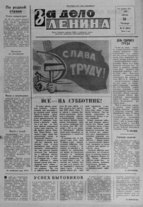 Пролетарии всех стран, соединяйтесь! Орган Северного райкома КПСС и районного Совета депутатов трудящихся Новосибирской области ВСЕ — Н А С У Б Б О ТН И К ! По родной стране У с п е х инициаторов По 100 тонн молока надоили с начала года мастера машинного доения со в х о з а «К о с т р о м с к о й » Г. Амрахова и 3 . Сироткина — инициаторы соревнования за у в е личение производства ж ив отн о водческой продукции, развернутого в К о стром ской области по примеру киевлян. Каж д а я из них об с л у ж и в а ет по 100 коров . В начале года А м р ах ова и Сироткина пересмотрели принятые на пятилетку обязательства и р е шили надоить по 1000 тонн м о лока не за пять лет, как рассчитывали прежде, а за три года! Почин передовых ж ив отн ов од ов подхватили многие доярки о б л а с ти. Запча сти из полимеров В Бижбу.пякском районном о б ъ единении «С ельхозтехника» Баш кирской АССР создан цех полимеров. Здесь из о т х о д о в полиэтиленов ог о прои звод ства делают б о лее ста наименований запасных частей для тракторов , а в т о м о б и лей, сеялок. Организовать их выпуск помогли коллективы нефтехимических предприятий авт оном ной республики, которые и с н а б жают. цех сырьем. Опыт показал, что запчасти из полимеров ничуть не х уже металлических, а подчас надежнее и долговечнее их. Н о винка значительно дешевле, п оз воляет экономить многие тонны металла. Хозяй ства Башкирии ох о т н о бер ут э ту продукцию, п о ступают заявки из многих о б л а с тей. П о э т ом у полимерное произв одство в Бижбуляке решено р а сширить. Весна в заповеднике В олж с к ую дельту в э т ом году необычно рано огласил птичий гомон. На о ст р о в а х , тихих реках и протоках поселились стаи л е бедей, гусей, уток , в ^етловых рощах появились ск ворцы, дятлы, дрозды, свиристели, зяблики. О р нитологи А ст р ах а н ск о г о г о с у д а р ственного заповедника имени В. И. Ленина и их помощники с о о р у ж ают для птиц искусственные гнезда, на лод ках развозят п о д кормку, веду т подсчет птичьих стай и наблюдение за ними. В э т ом г о д у в заповедную зону включены новые обширные у г о дья. Весенняя о х о т а в дельте Волги, как и в прошлые годы, повсемест но запрещена. Вести с полей Р о с т о в - н а 'Д о н у . Сев ранних яровых и з е р н о б о б о в ы х культур п одходит в области к концу. С е мена заделаны на площади, превыш ающей 600 тысяч гектаров, ч т о со с тавля ет свыше 90 процен- -тов в сего ярово г о клина. Брянск. К посадке картофеля •ранних со р т о в приступили м е х а низированные звенья к о л х о з о з и {Совхозов области. Картофельное гполе Брянщины — самое большое я Ро сси й ской Федерации: 120 тысяч гектаров. Житомир . М а сс ов а я посадка картофеля началась на Полесье. Более трех тысяч гектаров о т в е дено з де сь под новые в ы с о к о у р о жайные сорта, выведенные селекционерами Украинского НИИ картоф ельног о хозяйства. По сообщениям корр. ТАСС. 1 9 от в е т на постановление * * Ц К КПСС « О работе Министер ства б ы т о в о г о о б с л у живания населения Р С Ф С Р по улучшению качества выполнения заказов и повышения культуры обслужи вани я т р у д ящ их ся» на к омбинате ш иро ко развернулос ь соревнование между цехами, приемными пунктами в честь 60-летия Великого Октября . На общем собрании коллектива приняты индивидуальные и кол лективные обязат ель ства на текущий 16 апреля рабочие, колхо зники , служащие , студенты, учащиеся, даже пенсионеры— все население 