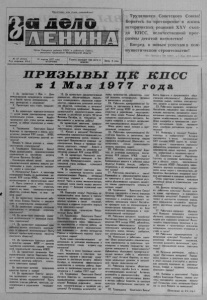 Пролетарии всех стран, соединяйтесь! 2 1 « 7 7 1 V Ор г а н Северного р а й к о ма К П С С и районног о Совета депут ат ов т р у д ящих с я Новосибирской области № 47 ( 4 5 5 3 ) Год издания 4 2 - й И) апреля 1977 года Газета выходит три раза и В Т О Р Н И К неделю Цена 2 коп. Трудящиеся Советского Союза! Боритесь за претворение в жизнь исторических решений XXV с ъ е з да КПСС, величественной п р о г раммы десятой пятилетки! Вперед, к новым у с п е х а м в к ом мунистическом строительстве! (И з Призывов ЦК КПСС к 1 М а я 1977 года) П Р И З Ы В Ы Ц К К П С С к 1 м а я 1 Э 7 7 г о д а , 1. Да здравствует 1 Мая — День международной солидарности тр удящихся в борьбе против империализма, за мир, демократию и социализм! 2. Пролетарии всех стран, соединяйтесь! 3. Да здравствует марксизм-ленинизм — вечно живое революционное интернациональное учение, знамя борьбы трудящихся всех стран против империализма, за победу социализма и коммунизма! 4. Трудящиеся Советского Союза! Боритесь за претворение в ж и з н ь историче ских решений XXV съезда КПСС, величественной программы десятой п я ти ле т ки ! Вперед, к новым успехам в коммунистическом строительстве! 5. Трудящиеся Советского Союза! Шире развертывайте социалистическое соревнование за достойную встречу 60-летия Великого Ок тября! Ознаменуем юбилей нашей могучей социалистической державы новыми достижениями в т р у д е , . развитии экономик и , н а у к и и к у л ь т у р ы ! 6. Коммунисты ! Будьте в авангарде всенародной борьбы за выполнение решений XXV съезда КПСС, активными организаторами и воспитателями масс! 7. Пусть славится в веках героический советский народ — строитель первого на земле коммунистического общества, сто йкий борец за мир во всем мире! 8. Да здравствует героический рабочий класс Страны Советов — ведущая сила в строительстве коммунизма! 9. Да здравствует славное колхозное крестьянство — а к ти в н ы й строитель | коммунизма! 10 . Да здравствует советская народная интеллигенция — а к ти в н ы й строи- 1 тель коммунизма! 11 . Да здравствует нерушимый союз рабочего класса, колхозного кре стья н ства и народной интеллигенции! Пусть крепнет идейно-политическое единство советского общества! 12 . Да здравствует братская дружба и единство народов СССР великое завоевание социализма, триумф ленинской национальной политики КПСС! 13 . Да здравствует ленинская Коммунистиче ская партия Советского Союза — партия на учного коммунизма, испы танный авангард рабочего класса, всего советского народа! Да здравствует великое нерушимое единство партии и народа! 14 . Да здравствуют Советы депутатов трудящихся — самые представительные органы народовластия! Пусть ширится участие рабочих, крестьян, и н теллигенции в управлении государством! 15 . Да здравствует социалистическая демократия, обеспечивающая социальную справедливость, подлинное народовластие, гармоничное сочетание интересов общества, коллектива и личности ! 16 . Советские профсоюзы! Всемерно развертывайте социалистическое соревнование за достойную встречу 60-летия Великого Октября, за повышение эффективности и качества работы! Да здравствуют советские профсоюзы — школа управления , шнола хозяйствования , школа коммунизма! 17 . Юноши и д ев уш ки ! Настойчиво овладевайте м арксистско -ленинским уче нием, достижениями н а у к и , те х н и ки и к у л ь т у р ы ! Приумножайте славные революционные, боевые и трудо