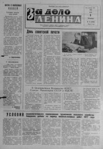 ч ВЕСТИ С КОЛХОЗНЫХ П О Л Е Й Готовят землю под посев Механизаторы колхоза имени К. Марксам выступили инициаторами соревнования за высококачественное проведение весеннего сева, за высокий урожай. Сейчас обязательство пришло время выполнять на практике. Первомай они встретили в борозде. Накануне праздника, 30 апреля, тракторист Ичкалинской бригады Василий Федорович Асанов вспахал 10 гектаров. Вышел на работу и первого мая, вспахав в этот день еще 10 гектаров. Работала трактористы хозяйства и на культивации. Ее намерены произвести на всем яровом клине. За первые дни мая, таким образом, подготовлено более шестидесяти гектаров пашни. Одновременно с- подготовкой почвы-под посев зерновых ведется боронование озимых. Всего обработано 174 гектара ржи, а сорок гектаров из них заборонено Михаилом Лукьяновичем Тихоновым. А. ПОДРЯДЧИКОВА. С энтузиазмом — Сеять пора,— не терпится механизаторам колхоза «Заветы Ильича». — Время торопит. Время торопит, а погода диктует свое: прошедшие дожди увлажнили землю и выехать с сеялками пока нельзя. Зато вести весновспашку вполне можно. На пахоте в хозяйстве работают восемь агрегатов. Почти' двести гектаров вспахано механизаторами. С первых дней полевых работ вспыхнул огонек трудового соперничества. Более тридцати гектаров вспахано одним из старейших трактористов колхоза Пданом Петровичем Ко- черешко, сорок гектаров — комсомольцем, водителем К-700, Виктором Слепцовым. С энтузиазмом работают на прибивке влаги молодые механи- _ __ ... Николай Буглеев и Владимир Шаев. Комсомольцы выполняют дневные нормы на 1 1 5 — 1 2 0 процентов. Всего же в колхозе прибито влаги на площади в 3 3 0 гектаров. И. ТИМОФЕЕВ, учетчик. Пролетарии всех стран, соединяйтесь! Орган Северного райкома КПСС и районного Совета депутатов трудящихся Новосибирской области Год и здания 42-й 1977 МАЯ 5 Четверг № 54 (4560) Цена 2 коп. День советской печати Генеральный секретарь ЦК КПСС товарищ Л. И. Брежнев указывал, что печать оказывает «могучее влияние на всю жизнь страны». И в самом деле, в СС Р издается 1 2,7 тыс. газет и журналов на 5G языках народов нашей страны. Разовый тираж газет более 1 68 миллионов, а журналов — около 1 75 миллионов экземпляров. Советская печать — часть общепартийного дела. Она мобилизует массы на все новые и новые трудовые свершения по выполнению решений партии и ее съездов. В настоящее время советская пресса всесторонне разъясняет трудящимся решения XXV съезда КПСС, ведет решительную и непримиримую борьбу за выполнение плана десятой пятилетки, за повышение качества работы, промышленной и сельскохозяйственной продукции. Газеты, журналы, радио и*телевидение широко рассказывают о передовиках социалистического соревнования, раскрывают их опыт, критикуют недостатки и отставание в работе. Советская печать, находясь на переднем крае идеологической борьбы, дает читателю конкретный материал для сопоставления двух противоположных социальных систем. Слово нашей прессы" авторитетно звучит на всех континентах, доносит до трудящихся всех стран мира правду о социалистическом образе жизни, о миролюбивой внешней политике Советского государства, о последовательной реализации Программы мира. У советской прессы миллионы добровольных помощников. Поистине, как указывал Б. И. Ленин, на 10 специа- листов-журналистов имеются 1 00 , 1 0 0 0 рабочих и сельских 