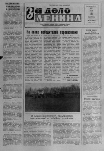 2 ri i i i i i i i i i i i i i i i i i i i i i i i i i i i i i i i i i i i i f i i i i i i i i i t i i i i i i i i i i i i i i i t i i i i i t i i i i i i i i i i i i i i i i i i i i i «ЗА ДЕЛО Л Е Н И Н А » i l i i l i l i i i l l l l l l l l l l l l l i i i i l l i l l l l l l l l l l l l l l 21 мая 1 9 7 7 года ф № 61 В х о д е с о р е в н о в а н и я вы являются н е то ль к о п е р е д о в и к и , п о б е д и т е л и , но и о т с т а ю щ и е . С о р е в н о в а н и е п о м о г а е т тем с амым с о с р е д о т о ч и т ь силы на и сп р а в л ен и и н е д о с т а т к о в , на п о д т я ги в а ни и о т с т а ю щ и х у ч а с т ков , чтобы у с к о р и т ь о бщ и й п о д ъ е м . Л . И. Б Р Е Ж Н Е В . каждый знал Чтобы В нашем колхозе гласности итогов соревнования с л у ж а т д а в н о испытанные и проверенные практикой методы. П р е ж де всего, результаты п одвод я т с я по пятидневкам, как и в прошлые годы. Лучший а г регат. звено, б ригада отме чаются переходящим Красным вымпелом или флаж ком . О д новременно с их вручением механизаторы получают и д е нежное в о знаграждение, как и предусмотрено условиями соревнования . О передовиках на к а ж д о м из видои весенне- полевых работ сообщается в стенной печати и р а д и о ж у р нале, п ередаваемом по местному радио. Говорит о тех, кто добился наивысших рез у л ь т а т о в , и ф л а г Трудовой славы. Это, та к с к а з а т ь , «старые» методы. Есть у нас и кое-что новое, введенное только этой весной. В частности, п одв едение итогов работы тр а к т о р и стов не з а смену, а за сутки. Д е л о вот в чем. У нас есть возможность организовыв ать в горячие страдны е дни д в у х сменную раб о ту тр ак торов. Это, безусловно, хорошо. Но вот что получалось, когда итоги работы подводились за смену. Обычно на трак тор ставились один тр ак торист опытный, а другой — из м о л о деж и , после окончания ОПТУ. Конечно же , «старички» д а в а л и большую в ы р а б о т ку, чем их напарники. Выгод- \ 17 мая к 9 часам вечера механизаторы Малиновской бригады колхоза нм. XXII съезда КПСС завершили посев зерновых культур. В хорошие сроки попали в землю семена пшеницы на площади 2 0 8 гектаров и овса — на площади 351 гектар. В тот же вече15 поздравить передовиков весеннего сева приехали секретарь парткома нее было им работать в одну смену. Так и оказывалось, что молодые механизаторы постоянно были не в почете, как бы ущемлены. Сейчас мы ввели подведение итогов работы за сутки: любой в ответе не только за себя, но и за своего напарника. Еще о д н а / новинка. «Наши показатели на весенне-полевых работах 1977 года» — так называется стенд, ко то рый оформлен в конторе кол хоза, На нем по графам указываю тс я все виды полевых работ, под определенной датой з аписывается общий результат по весновспашке, лущению, севу и т. д. В лю бую минуту каж дый ж е лаю щий может узнать, что сд е л а но в хозяйстве. Кроме того!" есть показатели и по к а ж д о му из тр ак то ристо в, занятом у в кампании. Здес ь т а к ж е в определенной графе вы с т а в л я ется резу льтат работы. Только если в первом случае п о к а з а тели выставляются с н а р а с т а ющим итогом, то во втором— фактическое выполнение механизатором сменного з адания. Пос евная н абрала теми. Погожие дни способствуют ударному труду механизато ров. Соревнование за качесг венное и быстрое проведение сева в разгаре. Но кто победит — покаж ет время. А. ЗАЙЦЕВ, секретарь партбюро колхоза «Заветы Ильича». Ю. П. Колязов и агитбригада Гражданцевского Дома культуры. В сельском клубе РЧ»б- рались механизаторы, за^тые на весновспашке, сеяльщики. Для н