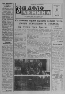 Пролетарии всех стран, соединяйтесь! Опыту передовиков— в с е ме р ну ю поддержку Товарищ Л . И. Брежнев направил Ипатовскому райкочу партии Ставропольского края приветствие, в котором, в частности, говорится: С огромным интересом о з . накомился с сообщением об опыте организации уборки у р о жая в Ипатовском районе. Большое удовл етворение вызывает творческая работа, которую проводит ваша районная партийная организация в этот наиболее ответственный перио д в сельскохозяйственном производств е, венчающий с о бой долгий самоотверженный труд земледельцев . Пример вашей партийной организации показывает, гово рится д а л е е в приветствии товарища Л . И. Брежнева, как в сельском хозя йстве н адо на деле претворять в жизнь з а д а чу, выдвинутую XXV съездом КПСС — сделать десятую пятилетку пятилеткой эффективности и качества. Уверен, что ваш опыт у ж е в этом г оду получит широкое распространение. Д ум аю , что все райкомы партии областей, краев и республик, вступающих в уборк у у р ож а я , воспользуются им. Это б у д е т способствов ать ускорению у б ор оч ных ра бот , увеличению сборов хлеба, выполнению и перевыполнению государственных планов закупок зерна. Товарищ Л. И. Брежнев пожелал колхозникам, рабочим с ов хозов , механизаторам, всем трудящимся района больших успехов в юбилейном году . Колхозные рационализаторы В начале июля с о с т о я л о сь заседание районного совета В с е с ою зн о г о общества и з обр е тателей и рационализаторов ( В О И Р ) и жюри по п о д в е д е нию и т о г о в см отра -к он кур са на лучшую п остановку и з о б р е т а тельной и рационализаторской работы в к ол хоз ах и се л ь ск о хозяйственных организациях района. По итогам за минувшее полугодие первое мес то п р и с у ж дено коллективу рационализат о р о в колхоза имени X X I I съезда КПСС. В ко лхозе подано и внедрено три рационализаторских предложения с г о довым экономическим эфф ек том в две тысячи рублей. След у ет отметить, что в р а з р а б о т ке и внедрении всех этих предложений уч аст вовал главный инженер хозяйства А. И. С ав - чиц. Ему было присуждено также первое место среди уч а стников к о н кур са -смотра. Рационализаторы колхоза « В о с х о д » внедрили два св оих предложения, от чего получили 2,5 тысячи рублей экономии в год. Они заняли в торое место . На третье вышли рац ио нализаторы ко лхоза «Память Ленина». В о всех этих первичных о р ганизациях ВОИР полностью со браны членские взносы. Эти организации премированы. Но сов сем иначе о б с т о я т дела в ко л х о з ах «Н о в а я жизнь», «7 -й с ъ е з д С о в е т о в » , «П у т ь к коммунизму». Здесь наблюдает ся недоимка по членским взносам , не внедрено ни о д н о го рационализатор ского предложения. Районная организация ВОИ Р приняла о б я з ат ел ь ств о — выполнить г о д о в о е задание по рационализаторскому фонду экономии в канун 60-летия В е ликой Октябрь ской соц иал и стической революции. Р айсовет о бщ е ст в а призывает все первичные организации рационализаторов и изоб ретателей шире развернуть социалистичес к о е сор евн ование по р а з р а б о т ке и внедрению рационализаторских предложений в х о з я й ств ах района В. СТЕПАНОВ, предс едатель совета ВОИР . Орган Северного райкома КПСС и районного Совета депутатов трудящихся Новосибирской области а « 5 / 1 а д Год издания 42-й 1977 ИЮЛЬ 21 Четверг № 87 ( 4 5 9 3 ) Цепа 2 коп. На заготовке к о рм о в дорожить к