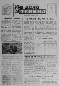О раз витии Нечерноз емья В Совете ' Министров Р оссийской Федерации состоялось совещание, обсудившее вопрос о ходе выполнения постановления ЦК КПСС и Совета Министров СССР «О мерах по дальнейшему развитию сельского хозяйства Нечерноземной зоцы РСФСР». На совещании выступил канд и да т в члены Политбюро ЦК КПСС, П редседатель Совета Министров РСФ СР М. С. Соломенцев. Пролетарии всех стран, соединяйтесь! |)<н| 2 № Л и ^-------- с 1л Орган Северного райкома КПСС и районного Совета депутатов трудящихся Новосибирской области Год издания 43-й 1977 ИЮЛЬ 28 Четверг № 9 0 ( 4 5 9 6 ) Цена 2 коп. Х л е б о у б о р к а н а ч а л а с ь ! НЕ ОСЛАБЛЯТЬ ТЕМПЫ РАБОТ НА Л У Г А Х ! Вот и пришла пора уборки урожая. Первыми приступили к косовице ржи механизаторы колхозов «Восход» и «Путь к коммунизму». Одновременно эти хозяйства ведут и осенний сев. По телефону нам сообщили: М. С. Сорокин, секретарь парторганизации: — Косовицу ржи начали в обеих бригадах колхоза. Свалено ее уже 56 гектаров. Уборку ведут в Чебаках комбайнеры В. Ф. Афанасьев, В. С. Трибуналов, Г. В. Голубев и Н. М. Дмитриев. Два дня п ^ а б о т а л на косовице Г. В. Блинов, комбайнер Ви- тинской полеводческой бригады. Ведем мы и сев ржи. В первой бригаде трактористы 10. Кержин и Н. Почтарйков разместили эту культуру уже на 37 гектарах. Из Биазы сообщил редакции А. С. К ул ико в , председатель колхоза: — Наши механизаторы начали косить рожь. Засуха нанесла большой ущерб — рожь уродилась неважной, поэтому большую часть будем убирать прямым комбайнированием. На семенных участках решено применить раздельный способ. 120 гектаров ржи уже уложедо в валки. Первыми на хлебоуборку выехали комбайнеры В. Сидоров, Н. Савчук и; А. Харитонов. Идет и сев ржи. 140 гектаров из 8 0 0 , намеченных по плану, уже засеяно. Итак, страда хлебоуборочная началась. По телефону же сообщили, что вчера выехали косить рожь и механизаторы колхоза имени XXI съезда КПС . С тотысячная арм ия ме ханиза торов участвует в этом году в уборке хлебов па Кубани. В соотв етствии с о б я з а т е л ь с т в а ми предстоит собрать 8500 тысяч тонн хлеба, из них 4250 тысяч тонн продать государ ству. На снимке: обмолот ячменя в колхозе «Заветы Ленина» Северского района. Средний ур ож ай — 42 центнера с гектара . Фото Е. Шулепова (Фотохроника ТАСС). По п р и м е р у ипаш овц ев В липецких х о зяй ств а х р а з вернулась м ассов ая ж а т в а хлебов. С первых дней с т р а ды вперед вышли з ем ле де л ь цы Уеманекого района — од ного из крупнейших поставщи ков зер н а в области. — Наши хлеборобы широко используют опыт И п ато в - ского района Ставропольского к р а я , — говорит первый сек р е тар ь Усманского райкома партии В. С. Р осляков. — Вся политическая работа в колхозах и со вх о з ах нап равлена на быстрейшее проведение ж а т вы й хлебоза готовок. В х озяй ств а х повсеместно созданы уборочно - тр ан сп о р т ные комплексы. В к аж дом комплексе действует временная п а р ти йн ая группа . На центральных токах — агитпункты, в к а ж д ом звен е агитатор и политинформатор. Коммунисты временной п а р т группы расставлены на самых отв етственных участках. Общей цели подчинены т а к ж е дей ст вия постов н ародного контроля, депутатских , комсомольских. Один из агитпунктов — на току колхоза «Мая к коммунизма». Здесь каж дый мож е т ознакомиться с ходом выполнения социалистических о б я з а т е л ь с т в колхоза в целом, о б я з а т е л ь с т в
