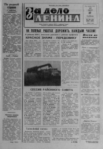 Пролетарии всех стран, соединяйтесь! Орган Северного райкома КПСС и районного Совета депутатов трудящихся Новосибирской области Н» ПОЛЕВЫХ РАБОТАХ ДОРОЖИТЬ КАЖДЫМ ЧАСОМ! В райкоме КПСС, исполкоме райсовета и райкоме п р о ф с о ю з а К Р А С Н О Е З Н А М Я — П Е Р Е Д О В И К У П о родной стране С победой, •А р кт и к а *! МУРМАНСК. (Корр. ТАСС). 23 августа в Мурманский порт вошел атомный ледокол «Арктика». Корабль, впервые в мире достигший Северного полюса, возвратился в родные воды, от. куда вышел 13 суток назад. В стремительном броске атомоход преодолел 3852 мили. Из них 1609 миль заняли переходы через ледовые поля, а 1200 миль пришлись на сплошной покров мощных многолетних льдов. В географической точке Северного полюса был торжественно водружен Государственный флаг СССР. Это событие участники плавания посвятили 60-й годовщине Великого Октября. Встречные суда приветствовали «Арктику» продолжительными троекратными гудками и традиционным приспусканием флага. А на берег Кольского залива уже вышли тысячи жителей города, друзья, родные и близкие отважных мореплавателей. На причале состоялся Митинг, его участники единодушно приняли приветственное письмо в адрес Генерального секретаря ЦК КПСС, Председателя Президиума Верховного Совета СССР товарища Л. И. Брежнева. Х л е б — Родине Белгород. Последние комбайны колхозов и совхозов области ушли с полей ранних зерновых, занимавших 842 тысячи гектаров . Несмотря на то, что на п р о тяжении почти всей жатвы часто выпадали д ож д и , у р ож ай убран в оптимальные сроки, без потерь. В зак рома Родины засыпаны сотни тысяч тонн пшеницы, яч меня, рж и , гороха. Ульяновск. 300-тысячную тонну хлеба отправили в зак р ом а госуд ар ств а земледельцы области. Первыми выполнили социалисти ческие о б яз ате л ьс тв а по продаже зерна тр уженики С тарокулаткин- ского района. Иркутск. Массовую уборку з е р новых и зернобобовых культур ведут колхозы и совхозы о б л а сти. Хлеба скошены и уложены в валки на первых ста ты сячах гектаров . В хозяйствах созданы 307 комплексных уб орочно-транспортных отрядов . Челябинск. На миллионе гектаров — половине всей уборочной площади — завершен а косовица хл еб ов в области. Во многих хозяйств ах зерновые культуры у к л ады в аю т в сдвоенные валки. Минск. Более полумиллиона тонн зерна нового у р о ж а я — вдвое больше, чем к этому времени прошлым летом — д о с т а в и ли на элеваторы автоколонны министерства автомобильного тр анспорта БС С Р и «Б ел сел ьхоз- техники». Маршруты хлебных трас с освоили 3300 автопоездов и грузовых машин. В резуль тате колхозы и совхозы Белоруссии высвободили большое количество тр анспорта д л я обслуживания комбайнов. Растет гигант энергетики На Енисее п р о до лж а е т с я со оружение Саяно-Шушенской ГЭС. Многотысячный ко ллектив ги др о строителей успешно несет т р у д о вую в а х т у в честь 60 -летия Великого О к т яб р я . Полностью освоен левобережный котлован , р азв ер ты в аю тся работы на з д а нии I Э С , с о о р у ж а е т с я причал Для приема оборудов ания . Д о нуска первых агре гатов необходимо у л ож и ть в тело плотины свыше двух миллионов к у б ом е т ров бетона. Н а стройку поступают н о ва я техника и механизмы, Впервые в практике отечес твенного гидростроительства применяются новые мощные краны д ля у к л а д ки бетона. (Корр. ТАСС). Бюро райкома КПСС, исполком райсовета и презид