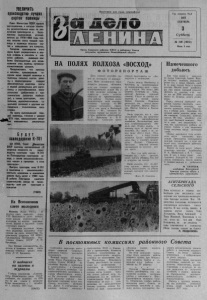 УВЕЛИЧИТЬ производство лучших сортов пшеницы Совет Министров СССР п р и н я л по с тановление , в котором намече ны д о п о л н и те л ь н ы е меры по уве личенига производства и безус ловном у выпо лнению у с т ан о в л е н н ы х на 1978 -198 0 годы п ла нов з а к у п о к зерна твердой пше н иц ы и пш е н ицы с и л ь н ы х сор т ов и повышению его качества Товарное производство з т о г зерна б у д е т сосредоточено в пер вую очередь в к о л х о з а х и сов х о з а х районов, имеющи х наи более б л а г о п р и я т н ы е д л я возде лы в а н и я э т и х пш е н иц почвенно к л им а т и ч е с к и е у с л о в и я . Предусмотрено, ч т о к о л х о зы и совхозы, производящие т о варное зерно твердой пш е н ицы и пш ен ицы с и л ь н ы х сор тов, д о л ж ны в первоочередном порядке обеспечивать ся семенами э л и т ы и первой р е пр од ук ции д л я сор то смены и сор тообновления, минеральными удобрениями и ядохим и ка там и ( в к л ю ч а я ге рбицид ы ) , а т а к ж е трак торами, комбайнами, зерноочиститепь но . с у ш и л ь н о й т е х н и к о й и др у гим и мат е р и а л ь н о - т е х н и ч е с к и м и средствами. На зерно высокоценной т в е р дой пш е н ицы , начиная с у р о ж а я 978 года, предусмотрена введе- ие по в ы ш е н н ы х з а к у п о ч н ы х цен. Будут павлодарские К-701 Ц К К П С С , Совет ^Министров СССР п р и н я л и поста н о в ле н ие « О создании мощности по произв о д с тв у т рак торов т и п а К-701 на Павлодарском тракторном заводе, а т а к ж е с е л ь с к о х о з я й с т в е н н ы х машин и прицепов к этим т р а к т о р а м » . В ы п у с к т рак торов т и п а К-701 в ко мплексе с с е л ь с к о х о з я й с т венными машинами и прицепами д о лж е н б ы т ь н а ч а т с 1983 года. В районе Павлодара намечено с т р о и т е л ь с т в о завода по произв о д с тв у шин д л я т рак т оро в и прицепов. ( Т А С С ) На Всесоюзном с л е т е м о л о д е ж и Иваново. (Корр. ТАСС). 31 августа здесь вспыхнул огоиь V I I I Всесоюзного слета победителей похода комсомольцев и молодежи по местам революционной, боевой и трудовой сл авы советского 'народа. С огромным подъемом встретили участники празд ника о г л а шенное на слете приветствие Генерального секретаря Ц К КПСС, П р е д с е д а т е л я Президиума В ерховного Совета СССР Л. И. Б р еж не ва . Под бурные аплодисменты д е легаты и почетные гости слета приняли отв етное письмо т о в а рищу Л . И. Бреж не ву . О подписке на г а з еты а жу р н а л ы Главное управление «Союзпе- шть» Министерства связи СССР сообщает, что подписка на 1978 на все газе ты и журналы гудет проводиться с 1 октября ю 1 д е к а б р я 1977 года. (ТАСС) Пролетарии всех стран, соединяйтесь! Орган Северного райкома КПСС и районного Совета депутатов трудящихся Новосибирской области Год издания 43-й 1977 СЕНТЯБРЬ 3 С у б бо т а № 106 ( 4 6 1 2 ) Цена 2 коп. КОЛХОЗА «ВОСХОД» Ф О Т О Р Е П О Р Т А Ж НА ПОЛЯХ День первого сентября ничем не отличался от п р е ды д у щих. Небо по-п режнему было за т я н у т о рваными облаками, шли, как говорят синоптики, кратковременные дожди. Но и в этих сложных погодных у с ловиях н,а полях колхоза «Восход» не пр ио с тан авл ив ались работы. Полным ходом механиза то ры вели косовицу силосных культур. Из 680 гектаров о ставалось убрать 140, в том. числе в Витинской бригаде — 30 гектаров. Н а нижнем снимке вы видите а г регаты витинских тр ак тористов А. С. Васи льева и В. П. Краснова. Силосную массу о тв о зят трактористы на « Б е - ларусях» с тележ кам и. Где-т о м е ж д у Витинском и Чебаками на освобожденном от подс