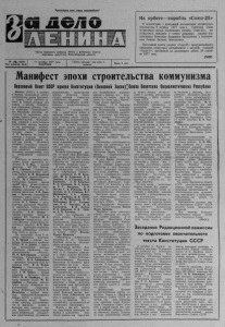 Пролетарии всех стран, соединяйтесь! «1 i i t s / i u Орган Северного райкома народных депутатов КПСС и районного Совета Новосибирской области № 1 2 ^ ( 4 6 2 8 ) I Год издания 43-й 11 октября 1977 года ВТОРНИК Газета выходит три раза в неделю J Цена 2 коп На орби те—корабль «С ою з -2 5 » В соответствии с программой исследования космического пространства 9 октября 1 9 7 7 года в Советском Союзе осуществлен запуск космического корабля «Союз-25», пилотируемого экипажем в составе командира корабля подполковника Коваленка Владимира Васильевича и бортинженера Рюмина Валерия Викторовича. Программой полета корабля «Союз-25» предусматривается проведение совместных экспериментов с научной станцией «Салют-6», выведенной на околоземную орбиту 2 9 сентября 1 9 7 7 года. ( Т А С С ) Манифест эпохи строительства коммунизма Верховный Совет СССР принял Конституцию (Основной Закон)ТСоюза Советских Социалистических Республик Москва. (ТАСС), 6 о к т я бр я в Кремле п р о д о л ж а л а работу внеочередная сессия Верховного Совета СССР д евято го созы ва. В первой половине дня вопрос о проекте Конститу ции (Основного З а к о н а ) Союз а Советских Социалистических Республик д епутаты о б с у ж д а л и на раздельных з а с е д ан и я х Совета Союза и Совета Национал ьностей. Выступающие говорили о неизгладимом впечатлении, ко то рое произвел на них всесторонне аргумен тированный, глубоко с о д е р ж а тельный д о к л а д то в а р ищ а Л . И. Б р еж н е в а на сессии. В д о к л а д е с большой в дохнов ляющей и мобилизующей силой д а н ан али з 60-летнего р азв и тия Советского го с у д а р с тв а , всеобъемлюще раскрыта суть р азвитого социализма, о тр аж ены неисчерпаемые силы и возм ожности советского строя. Н а к ан у н е , на вечерних з а с е д а н и я х п а л а т выступили д е путаты: А. Э. Восс — первый се крета рь Ц К КП Л ат в и и , М. С. Горбачев — первый се кр ета р ь Ста вропольского к р а й кома КПСС, Б. В. Петровский — министр зд р а в о о х р ан ен ия СССР , М. Т. Амантаева — учительница средней школы имен-rf' А б а я (Алм а-Атинская о б а с т ь ) , Р. Г. Гамзатов—пред с е д а т е л ь п р ав л ен ия Союза писателей Д а г е с т а н а , Г. Н. Смирнов — бригадир горнорабочих очистного з а б о я шахты «Юбил ей н ая» об ъединения « Г и д р о уголь», Л. Г. Тынель — пред с е да т е л ь исполкома Ч у к о т с к о го о круж ного Сов ета д е п у т а тов тр у д ящ и х с я (М а г а д а н с к а я о б л а с т ь ) , А. П. Ботвин — первый се крета рь Киевского горкома КП Украины, Ю. X. Тхайцухов—председате ль к о л х оза «Р осси я» (Адыгейская а в то номная о б л а с т ь ) , Я. П. Цие- кур — т рак торис т -ком байн ер со вх о з а «Вийциемс» ( Л а т в и й с к а я ССР ) и другие . Н а з а с е д а н и я х п а л а т 6 о к т я б р я выступили д еп у таты : А. К. Черный — первый се кр ета р ь Х а ба ровс кого кр айк ом а КПСС, Н. А. Злобин — б р и г а дир комплексной бригады строителей у п равлен ия « З е - леноградстрой» (М о с к в а ) , Ю. Н. Христораднов — первый с е к р ета р ь Горьковского о б к о ма КПСС, В. А. Амбарцумян —прези дент Академии наук Армянской ССР , Н. Д . Худай- бердыев — П р е д с е д а т е л ь Со в ета Министров Узбекской С СР , Г. И. Чиряев — первый се крета рь Якутск ого обкома КПСС, В. И. Теребилов — министр юстиции СССР , М. Те- мирбаев — бригадир п роход чиков шахты «С ев ер н ая » р у д о у п р а вл е н и я «Т аш к умы р - уголь» (К и р г и з с к а я С С Р ) ,Т . К. Мальбахов — первый с е к р е т а р ь К а б а р д и н о - Б а л к а р с к 