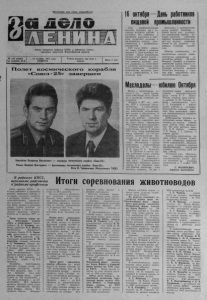 Орган Северного райкома КПСС и районного Совета народных депутатов Новосибирской области № 124 (4630 ) 15 октября 1977 года Газета выходит три раза в Цена 2 коп. Год издания 43-й СУББОТА неделю П о л е т к о с м и ч е с к о г о к о р а б л я « С о ю з - 2 5 » з а в е р ш е н Новалёнок Владимир Васильевич — командир космического корабля « С о ю з - 2 5 » . Рюмин Валерий Викторович — бортинженер космического корабля « С о ю з - 2 5 » . фртд В. Черединцева (Фотохроника ТАСС) 16 октября— День работников пищевой промышленности Свой профессиональный праздник отмечают д ва с половиной миллиона рабочих и служащих. Это хлебопеки и кондитеры, маслоделы и виноделы, труженики молочных и мыловаренных заводов, мясокомбинатов и парфюмерных предприятий. XXV съ езд КПСС определил новые рубежи в развитии пищевой и мясо-молочной индустрии. Перед тружениками отрасли стоит з ад ач а н а р яд у с увеличением об ъема производства повысить качество т о в а ров, расширить их ассортимент и улучшить питательные свойства, значительно увеличить производство продук тов питания в расфасованном и у п а кованном виде. Выполнить и перевыполнить планы десятой пятилетки — боевой лозунг всех коллек ти вов предприятий отр асли. Успешно закончили работники пищевой промышленности первый го д десятой пятилетки, многие из них досрочно з а вершили плановые з а д ан и я года. Широко развернулось на предприятиях отрасли социалистическое соревнование за достойную встречу 60-летия Великого О к т яб р я и успешное завершение планов второго год а д есятой пятилетки. Свой праздник тр уженики пищевой индустрии встречают в г о р я чую пору переработки се ль скохозяйственного сырья. Маслоделы— юбилею Октября Вместе с тружениками городов и сел нашей страны, несет юбилейную вахту О к тяб ря и коллектив Северного маслоз авода. Вступая в 1977 год, р або чие, ИТР и служащие з а в о д а включились в социалистическое соревнов ание з а досрочное выполнение государств енных планов и обязате льс тв. К 28 августа выполнен план двух лет десятой пятилетки по выработк е животного масла, сверх плана произведено 540 центнеров этой продукции. Успешно выполняются государственные планы 9- месяцев 1977 года. План производства масла выполнен на 115 процентов, цельномолочной продукции — на 115,7 процента. Достойный вкл ад в выполнение обязате льс тв внесли заведующие сепараторными отделениями А. И. Летов, В. Я. Смык, П. С. Федорова, Е. Ф. Ефимова и многие д р у гие работники нашей отрасли, которых отличают высокая ответственность и добросовестный труд. Самоотверженно пр о до лж а ет трудиться ветеран з а в о д а П. Е. Паршина , у д а р ник девятой пятилетки, член местного комитета . По д в е с половиной нормы выполняет у д ар н ик коммунистического труда столяр В. Т. Попов. Можно отметить тр у д сменного мастер а А. М. Глухова , р а бочей маслодельного цеха Н. Е. Калининой и многих дру гих рабочих и служ ащих произв одства, которые встречают Ден ь ра ботников пищевой промышленности высокими показателям и. Добросовестно трудится водительский состав з а в о д а , от которого во многом зависит ритм работы всего предприятия. Это член местного комитета Я. В Хмелев, шофера Т. К. Рецер, Г. Т. Соболев и многие другие . Коллектив масл о з аво да решает сейчас сложные задачи : з а счет повышения эффектив ности производств а, дисциплины труда , улучшения качества выр а ба тыв ае