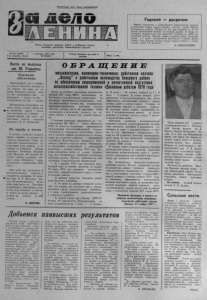 Пролетарии всех стран, соединяйтесь! i i e / i u Орган Северного райкома КПСС и районного Совета народных депутатов Новосибирской области № 143 (4649) 1 декабря 1977 года Г аз е та выходит три р а з а в й ЧЕТВЕРГ неделю Цена 2 коп. Г о д о в о й — д о с р о ч н о Херсон. . Первенство в соревновании животноводов области уд ержи в аю т до яр ки ордена Ленина колхоза имени Киров а Белозе рского района. Многие из них у ж е н ад о ил и по 4—4,5 тысячи килограмм ов молока от к а ж д о й коровы. В целом по хозяй ству годовой план у ж е выполнен, получено по 3.600 ки лограммов молока. Л у ч ш а я д о я р к а хозяй ств а Вера З а х ар ев и ч рубеж в 5 тысяч килограммов превзошла в первой д е к а д е ноября . Она получае т молоко только первого к л а с с а с содер жанием жи р а 4 3 процента А. СОЛДАТСКИЙ. Вести из к о л х о з а им. М. Г о р ь к о го К орм ам и обеспечены Общественный скот в хозяйстве неплохо обеспечен кормами на ату зимовку. Это видно из рациона. Например, коровам дают по пять килограммов сена, по пятнадцать — силоса, по два — концентратов, по три — соломы. Механизаторы продолжают вывозку грубых кормов. Перед ни- ч к м и поставлена задача — полностью доставить их к фермам к первому января. Для этого создано звено, которое возглавил коммунист И. Б. Лещинский. По т р у д у и честь В колхозе состоялось торжественное собрание, на котором чествовали передовиков. Среди победителей социалистического соревнования была названа и телятница из Рязанской бригады коммунист Валентина Владимировна Желудова. Ей вручили-Почетную грамоту, денежную премию и знак «Победитель социалистического соревнования 1.977 года». Этой чести она удостоилась за получение высоких привесов и сохранность молодняка. В прошл у ю зиму В. В. Желудова набрала 60 новорожденных телят, летом сама пасла их. Благодаря правильному и заботливому уходу сумела всех сохранить и получила привес за десять месяцев в среднем на . каждого по 600 граммов. П. СМИРНОВ. О Б Р А Щ Е Н И Е механизаторов, инженерно-технических работников колхоза „Восход" к работникам полеводства Северного района по обеспечению своевременной н качественной подготовки сельскохозяйственной техники к1полевым работам 1978 года Борясь за успешное выполнение исторических решений XXV съезда КПС , включившись во Всесоюзное социалистическое соревнование за повышение эффективности использования сель- скохозяйствениной техники, мы, механизаторы, инженерно-технические работники колхоза «Восход», сделаем все от нас зависящее, чтобы своевременно и качественно провести все полевые работы в третьем году десятой пятилетки. С большим вниманием ознакомились мы с постановлением ЦК КПСС и Совета Министров СССР «0 мерах по повышению эффективности использования сельскохозяйственной техники, улучшения ее сохранности, обеспечению колхозов и совхозов кадрами механизаторов и закреплению их в сельском хозяйстве», с инициативой тружеников Новосибирского, Ордынского, Коче- невского районов и совхозов треста «Овощепром» но обеспечению своевременной и комплексной подготовки к полевым работам 1 9 7 8 года. Проявляя постоянную заботу об урожае будущего года, мы, механизаторы, инженерно-технические работники колхоза «Восход», принимаем на себя следующие социалистические обязательства: — К 1 декабря 1 9 7 7 года выполнить квартальный план по ремонту тракторов, не позднее 20 марта 1 9 7 8 