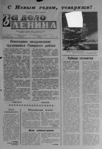 N» 1 5 6 ♦ 31 декабря 1 9 7 7 года l i n i i i i i i i i i i i i i i i i i i i i i i i i i i i i i i i i i i i i i i i «ЗА ДЕЛО Л Е Н И Н А » i l i i i i i i i i i i i m i M i i i i i i i i t i i i i i i i i i i i i i i i i i i i i i i i i i i i i i i i i i i i i i i H i i i i i i i i i i i i i i i i i i i i i i i 3 ДЛЯ Б Л А Г А Н А Ш И Х Активно, п о -деловом у В юбилейном году успешно проведена подписка на периодическую печать среди- ж и т е лей Северного района. А к тив но потрудились общес твенные р аспрос траните ли печати Р. Н. П е траченк о , Н. К. К о р ец к а я , О. Г. Ч а л к о в а , Н. И. Б о б р о в никова и многие другие . Б л а г о д а р я их д о б р о с о в е с т ному т р у д у , коллективы райпо, «С ельхозт ехники», МСО и д р у гих предприятий и о р г а н и з а ций районного цен тр а п о л у ч а ют все необходимые издания . В у становленные сроки про ведена подписка на периодические и зд а н и я в В е рх -К расноя р - ском, Г р аж д ан ц е в с к о м о т д е л е ниях связи , где начальники М. Д . Л е о н о в а , А. А. Корчи- гин. П о з д р а в л я ю всех их с н а ступающим Новым годом. И. ПЕТУХОВ, начальник отделения «Союзпечати». Трудовой вклад Успешным выполнением п л а нов з а к а н ч и в а е т юбилейный год ко л л ек тив ком би н а т а быто вого о б с л уж и в а н и я . Многие пер ед овики п р о изво д ств а , л у ч шие коллек тивы отм етили новый год еще в ноябре. На 136,3 процента выполнил г о довые з а д а н и я столярный цех, на 300 процентов выполнен план по ремонту мебели, у с пешно справились с п л а н о вы ми з а д а н и я м и пимокатный цех и д р у ги е п о д р а зд е л ен и я к ом би ната . Среди передовиков п р о и з в о дс тва отец и сын П о н о м а р е вы. П о н ом а р е в старший, с т о л я р ко м б и н а т а , выполнил г о довое з а д а н и е на 200 процен тов, н а г р а ж д е н з н а к о м «П о б едите ль социалистического с о р ев н о в ани я 1977 го д а» , з а н е сен на областную д о с к у П о чета р аб о тн ик о в бытового о б сл у ж и в ан и я . П е ревыполнили свои о б я з а т е л ь с т в а мастер пимокатного цеха И. П. К расн очеботьк о , мастер - п а р и км а х е р Н. М. С т е б у к о в а , з а к р о й щ и к К- А. Архипова . В стречая новогодний п раздник , п о з д р а в л я е м к о л л е к тив ко м б и н а т а , в етер а но в т р у д а и н аш у м о л о д еж ь с у с п е х а ми в т р у д е П. ЮДИН, директор быткомбината. Е. КОРОСТЕЛЕВ, секретарь партийной организации. Всю неделю, предшествующую новогоднему празднику, в магазинах Северного райпо шла оживленная торговля. Работники прилавка предложили покупателям в эти дни рыбу копченую и свежемороженую сельдь, фрукты свежие и консервированные, различные кондитерские изделия. В промтоварных магазинах особым спросом пользовались меховые швейные изделия, обувь, трикотаж. В магазине культтоваров оживленно шла торговля елочными игрушками. Точные данные будут несколько позже, но уже теперь можно с уверенностью сказать, что на одного человека в сред нем продано в этом году различных товаров на 8 5 0 рублей, а это почти на 54 рубля На днях в актовом зале Дома Советов состоялась районная конференция Всероссийского общества рационализаторов и изобретателей. С отчетным докладом высту пил председатель общества главный инженер сельхозуп- равления В. А. Степанов. В обстоятельном и интересном докладе он сделал анализ деятельности общества, подчеркивая, что отчетно-выборная конференция проходит в знаменательный в жизни советского народа период, отметил, что члены районного Совета В0ИР провели большую организаторскую работу в коллективах предприятий и колхозо